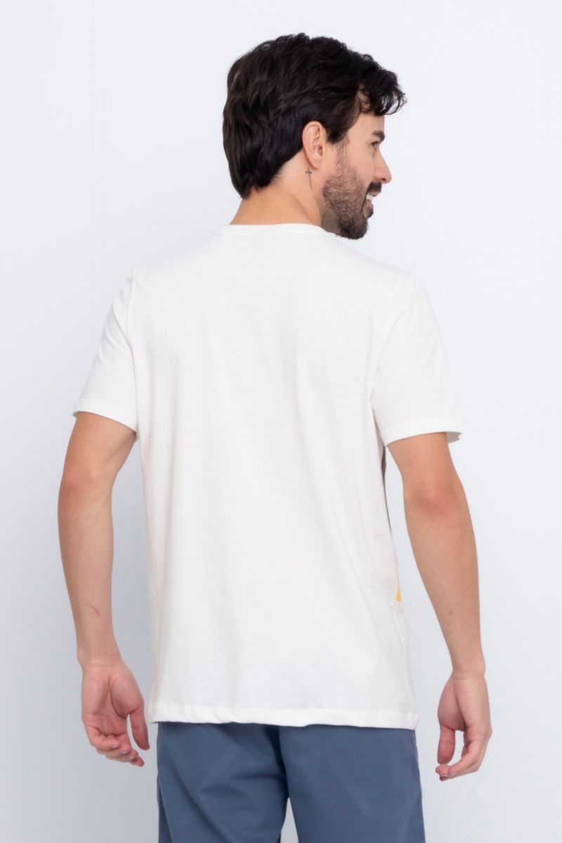 Camiseta masculina estampada. A peça possui caimento reto e solto, manga curta e gola redonda.