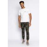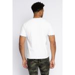 Camiseta masculina na cor branca com estampa frontal. A peça possui caimento reto e solto, manga curta e gola redonda.