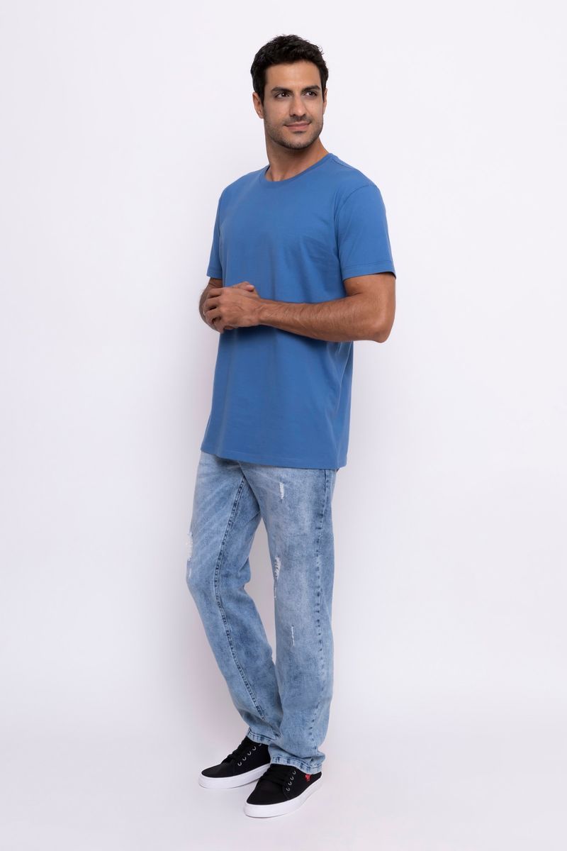 Camiseta masculina confeccionada em malha penteada. A peça possui caimento reto e solto, manga curta e gola redonda.