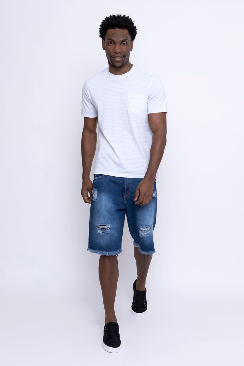 Camiseta masculina maquinetada. A peça possui bolso, caimento reto e solto, manga curta e gola redonda.