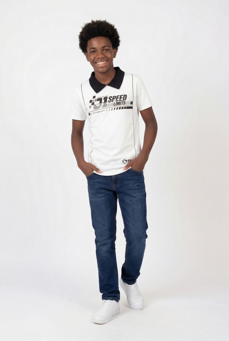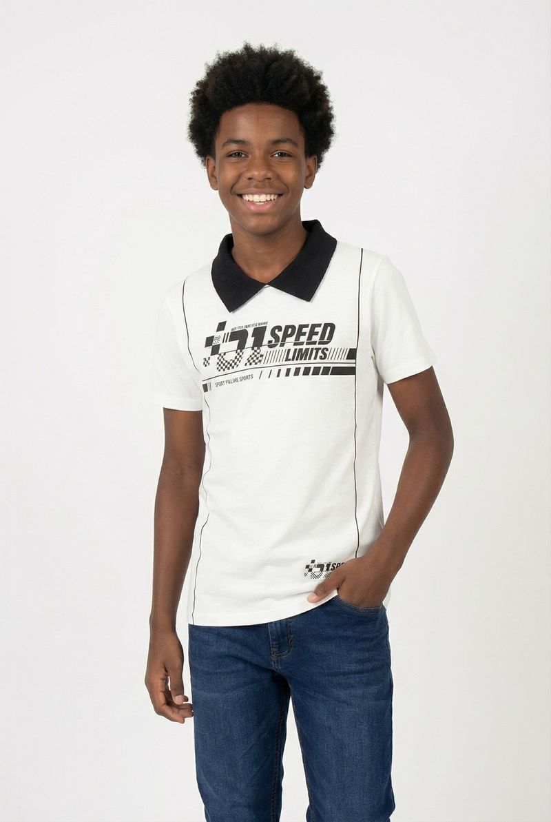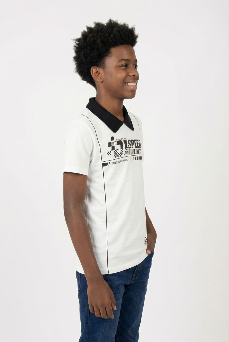 A Camiseta Polo Juvenil Esportiva Speed Limits Off White Caedu oferece conforto e estilo. Em 100% algodão de meia malha, garante toque suave. Com design esportivo e estampa 'SPEED LIMITS', é a roupa ideal para jovens.