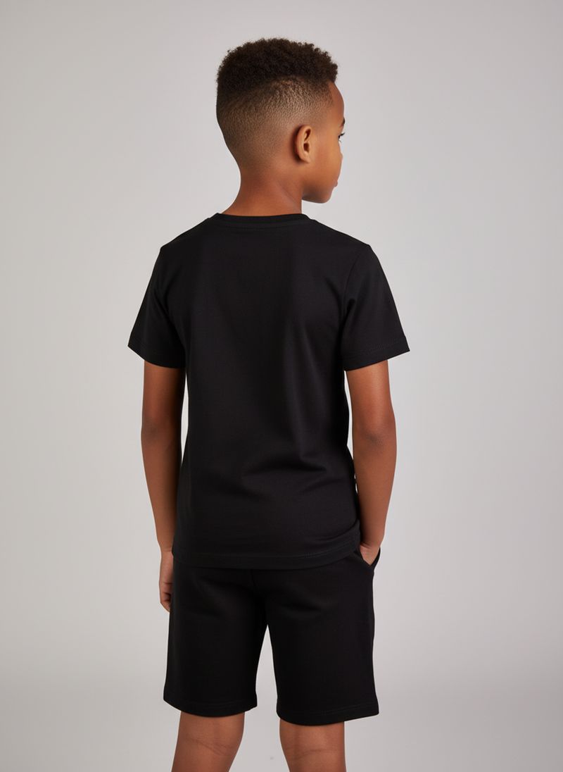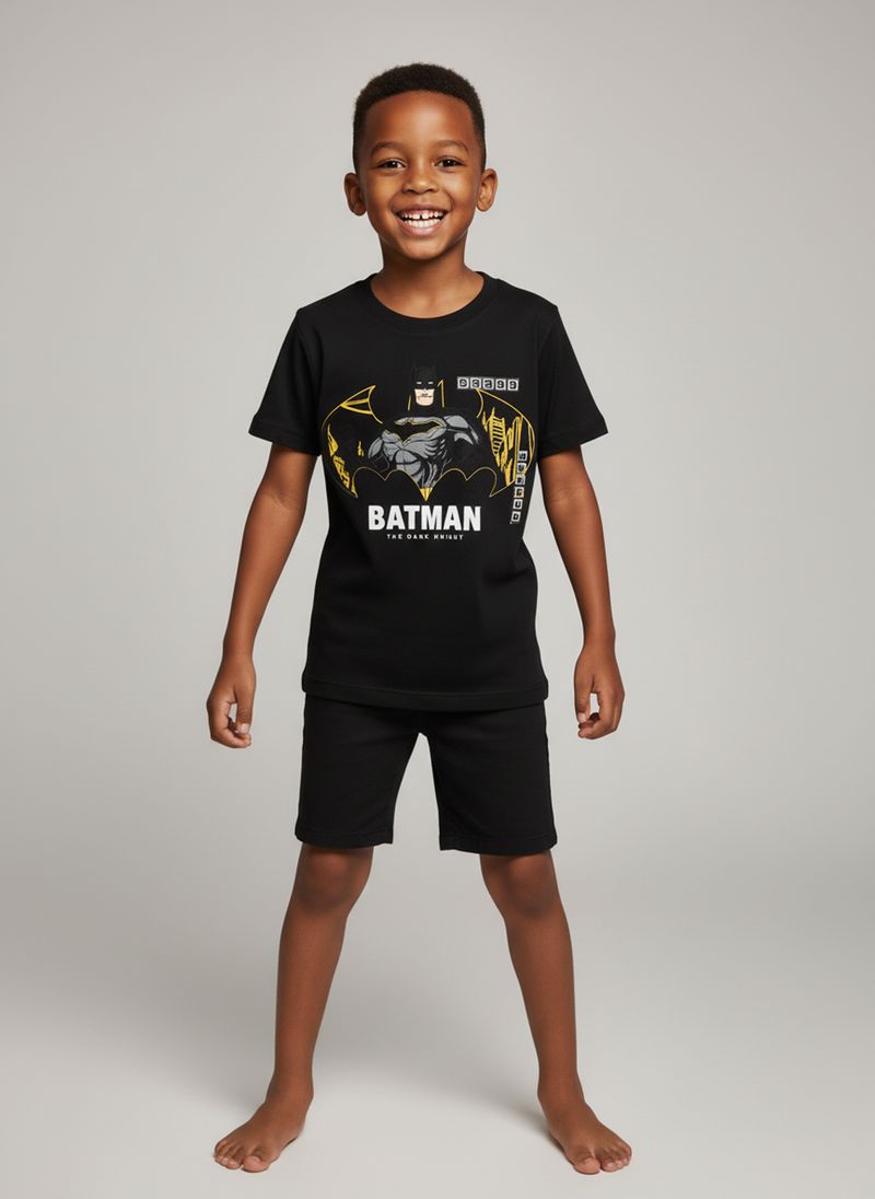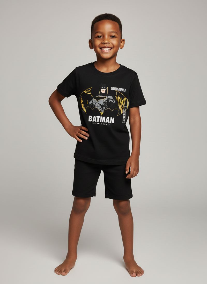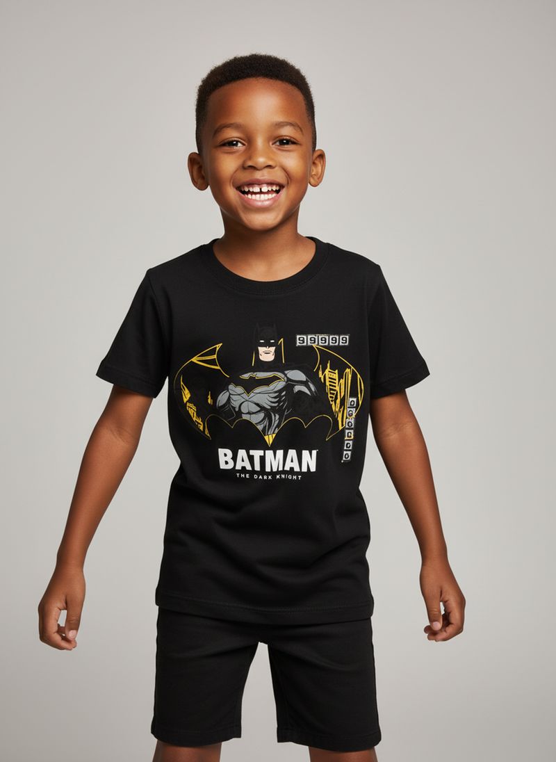 Combine a camiseta com uma bermuda preta ou jeans para um visual casual e despojado. Para um toque extra de estilo, adicione um tênis colorido e um boné. Em dias mais frescos, uma jaqueta leve pode complementar o look, mantendo o conforto e o estilo do seu pequeno herói.