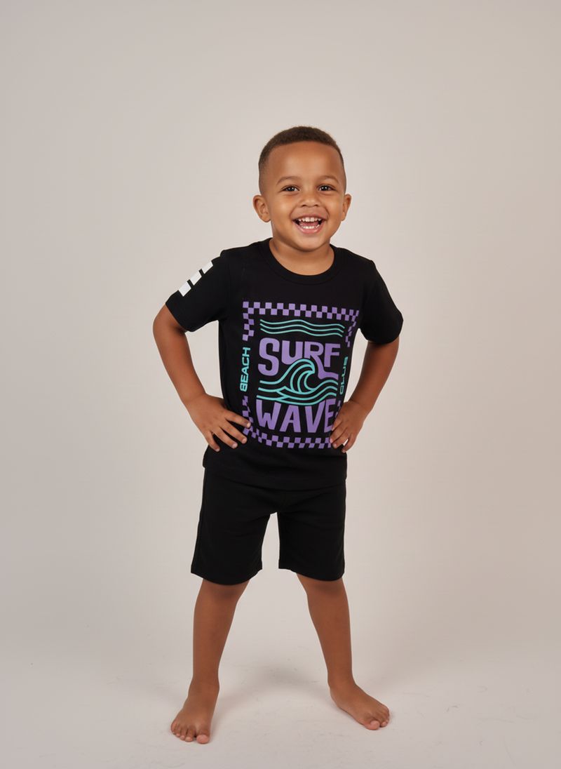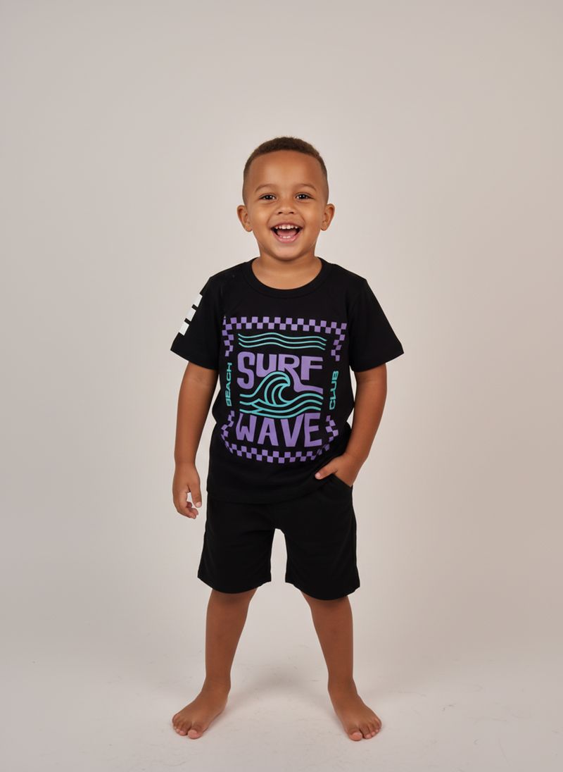 Camiseta Infantil Caedu 'Surf Wave Club' Preta com Estampa de Ondas e Xadrez