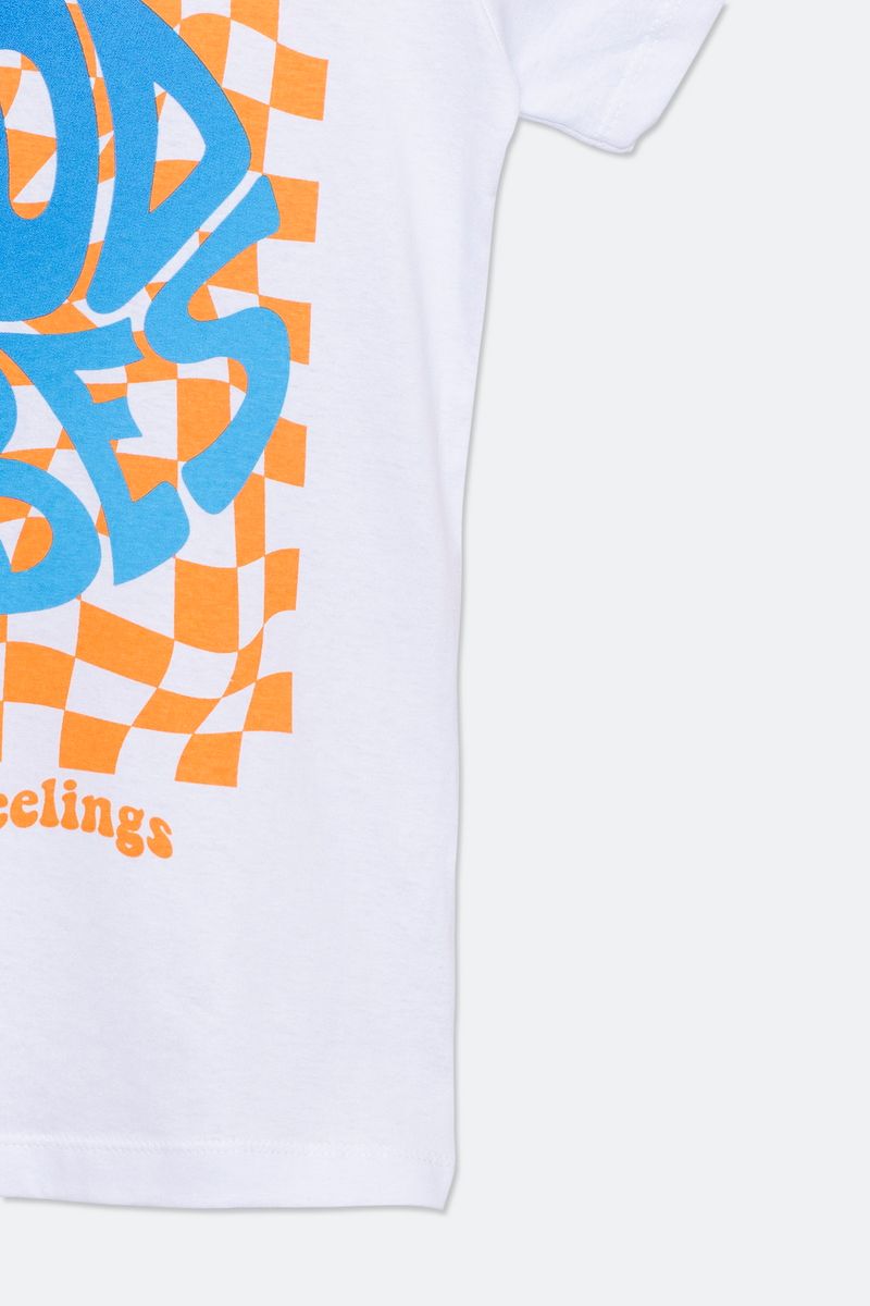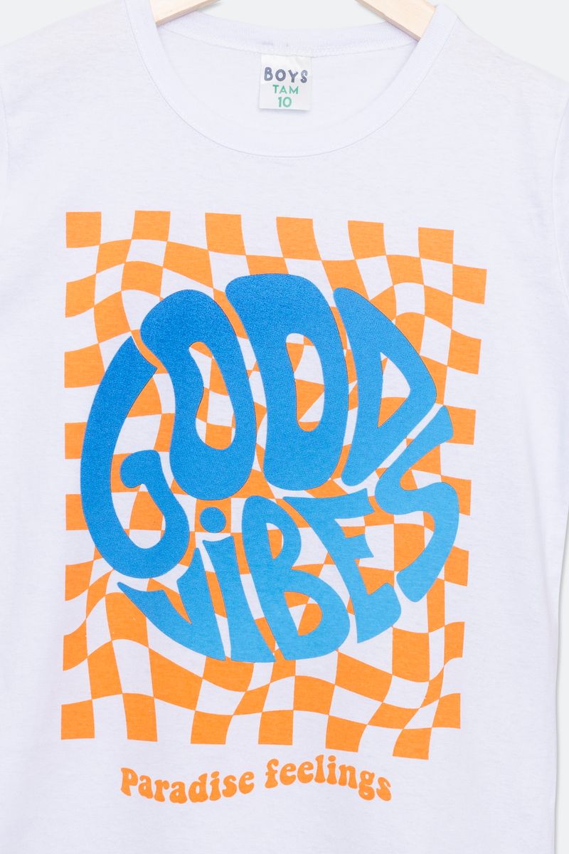 VestuárioInfantilNovidadesCamisetasCamiseta Juvenil com Estampa Good Vibes Branca Tam 10 a 16