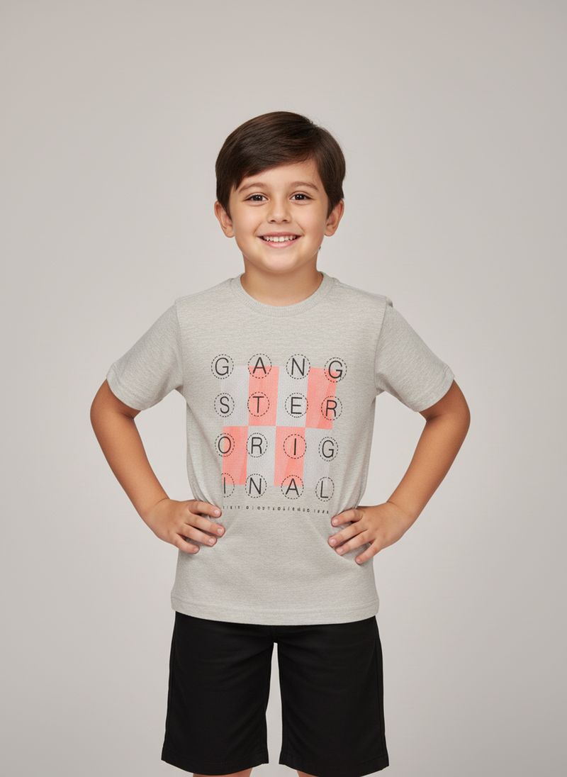 A Camiseta Infantil Caedu oferece conforto e estilo. Feita em 100% algodão de meia malha. A estampa 'Gangster Original' traz um visual autêntico, ideal para a moda infantil.