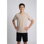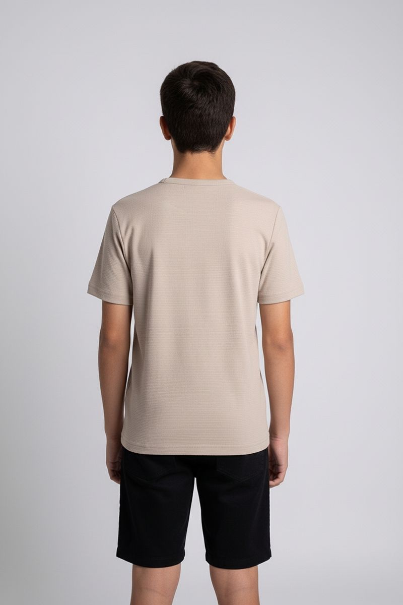 Combine a camiseta bege com shorts jeans ou de sarja para um visual despojado. Para um toque mais casual, aposte em calças pretas e tênis confortáveis. Uma jaqueta leve pode complementar o look em dias mais frescos, criando um visual moderno e prático para as crianças.