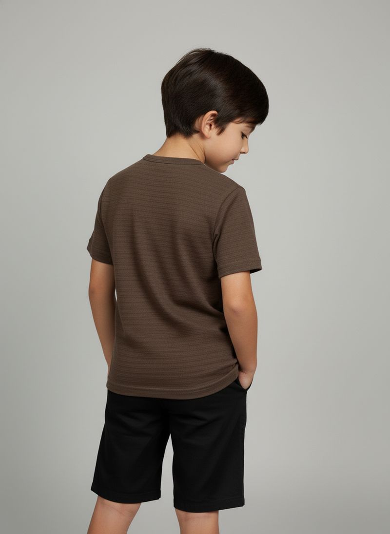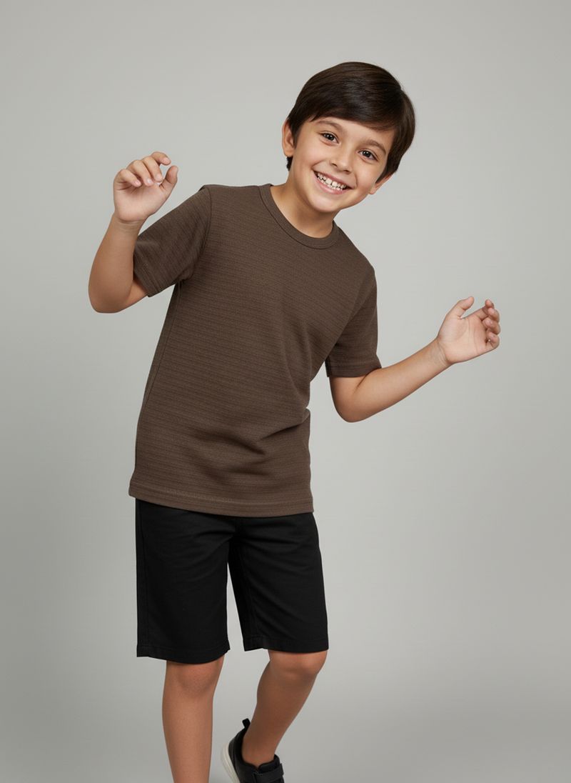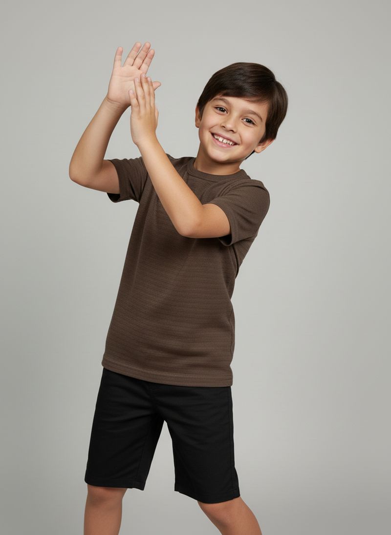 Combine a camiseta marrom claro com um shorts preto para um visual despojado e confortável. Para um look mais casual, use com uma calça jeans e tênis. Adicione uma jaqueta leve para as noites mais frescas, criando um conjunto versátil e cheio de estilo para seu filho. Explore a moda infantil Caedu e crie combinações incríveis.