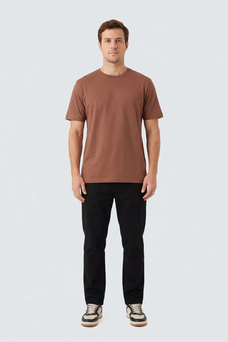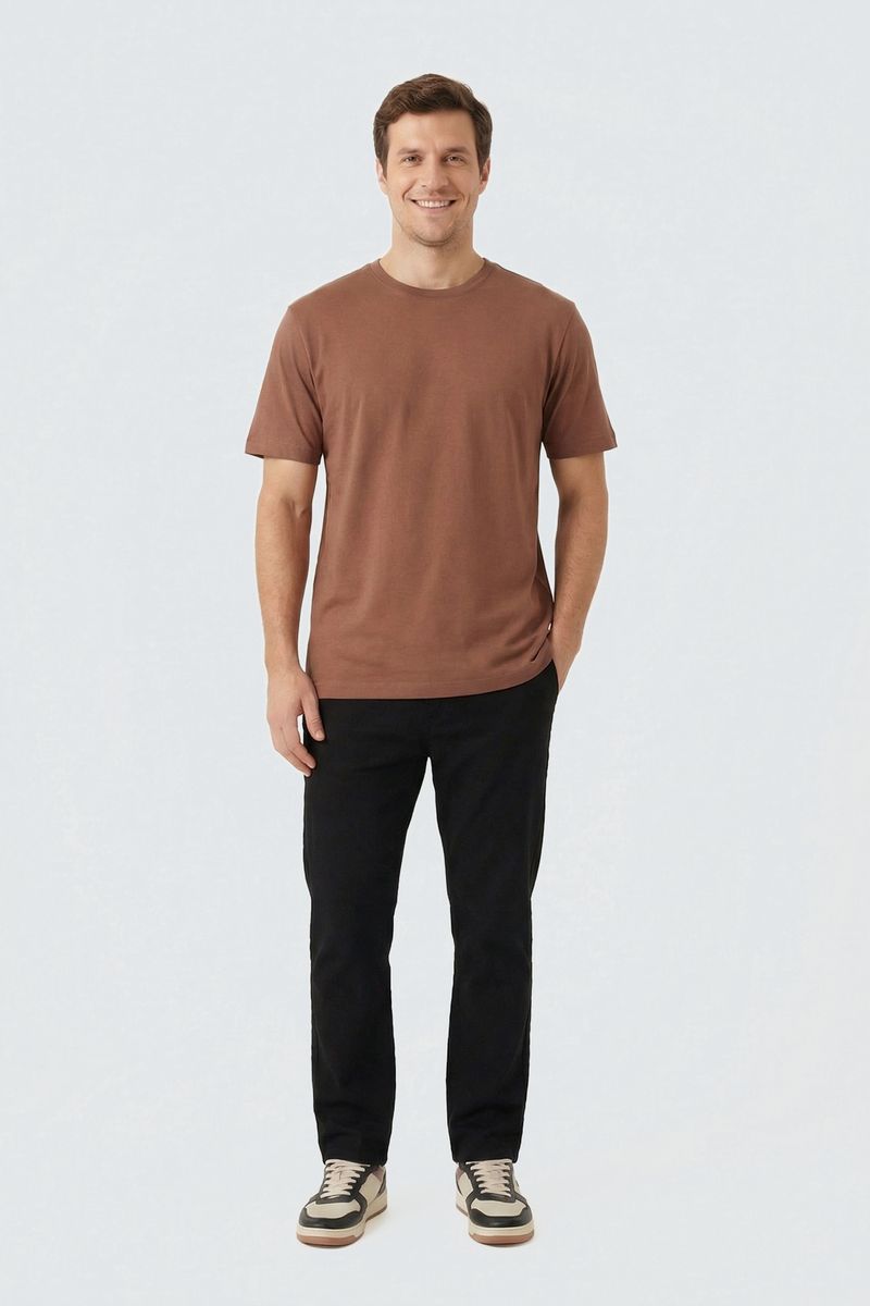 Eleve seu estilo com a Camiseta Masculina Essencial de Algodão Penteado Caedu. Em marrom médio, um tom terroso de alta moda, esta peça 100% algodão de meia malha oferece conforto superior e caimento impecável. Essencial para um visual moderno e versátil.