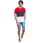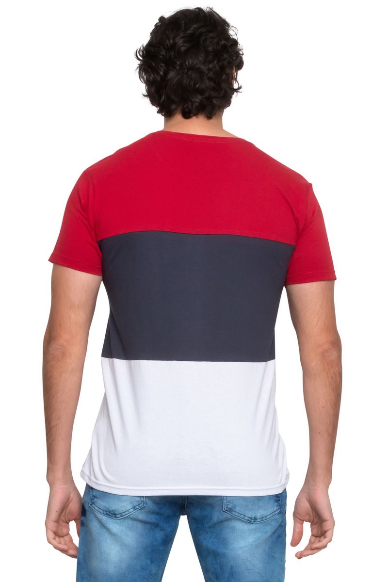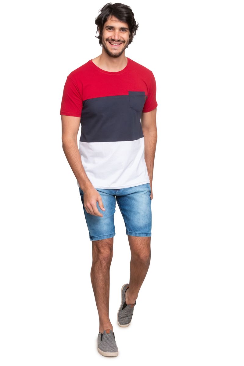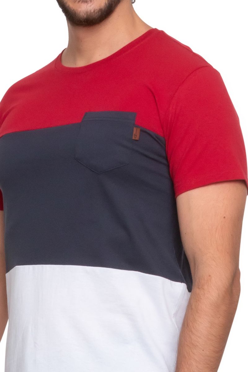 Camiseta masculina com bolso e faixas coloridas em vermelho, branco e azul-marinho.