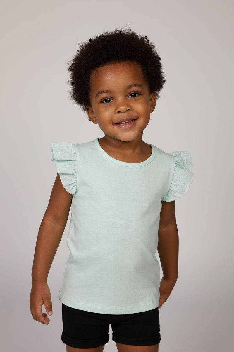 A blusa infantil Caedu verde menta, em meia malha, oferece conforto e leveza. Babados laise com padrão sutil nas mangas trazem charme e estilo à roupa menina. É a moda Caedu com bom preço!