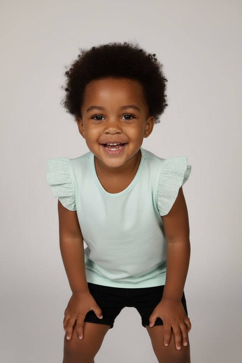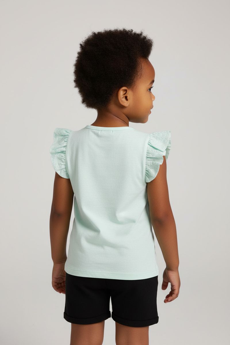 Combine esta blusa verde menta com shorts jeans ou de sarja para um visual casual e divertido. Para um toque mais arrumado, use com uma saia rodada e sapatilhas. Complete o look com tênis confortáveis para brincar ou sandálias delicadas para ocasiões especiais.