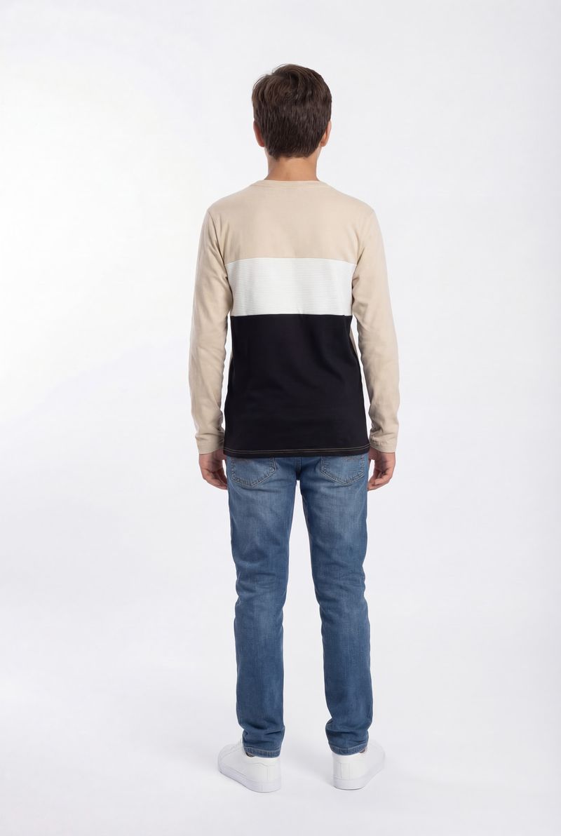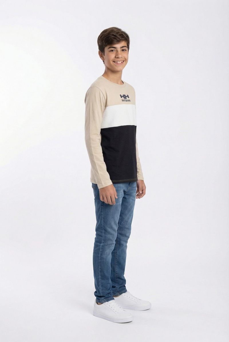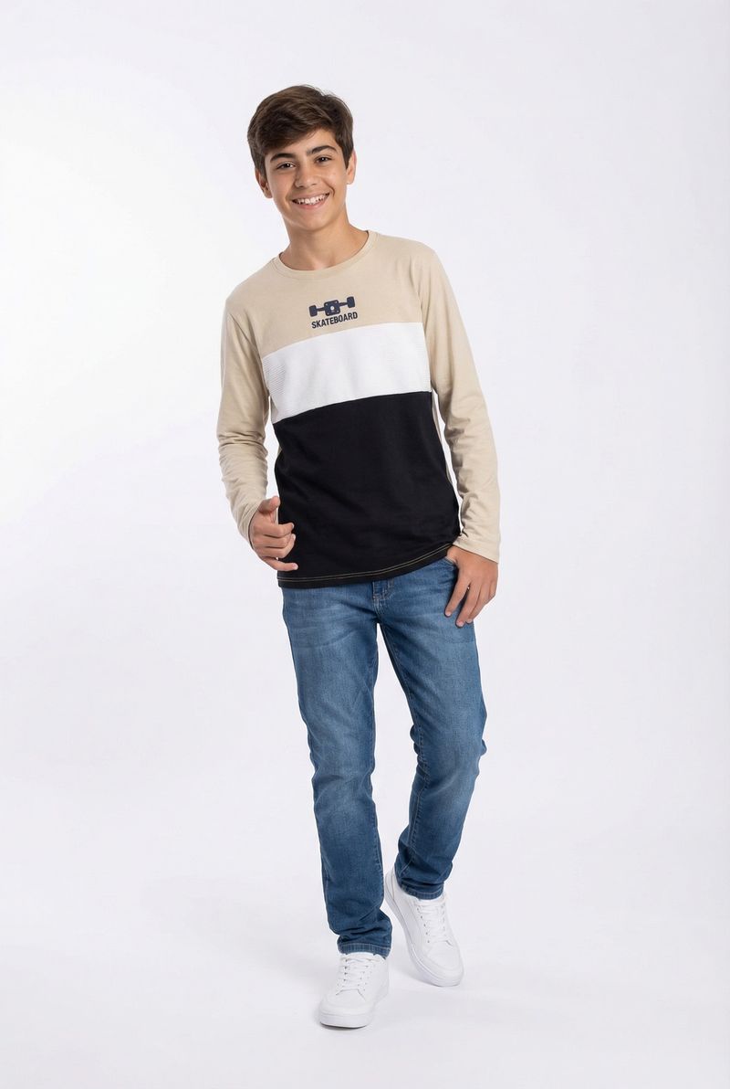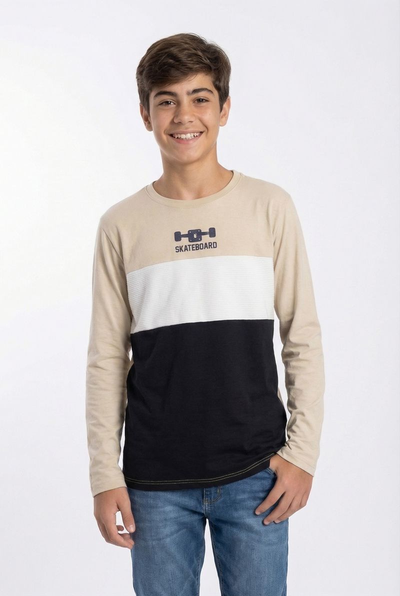 A Camiseta Juvenil Casual Manga Longa Bloco de Cores Skateboard da Caedu, em meia malha 100% algodão, oferece conforto e estilo. Com blocos de cores em tons terrosos e estampa de skateboard, destaque da nova coleção outono inverno.