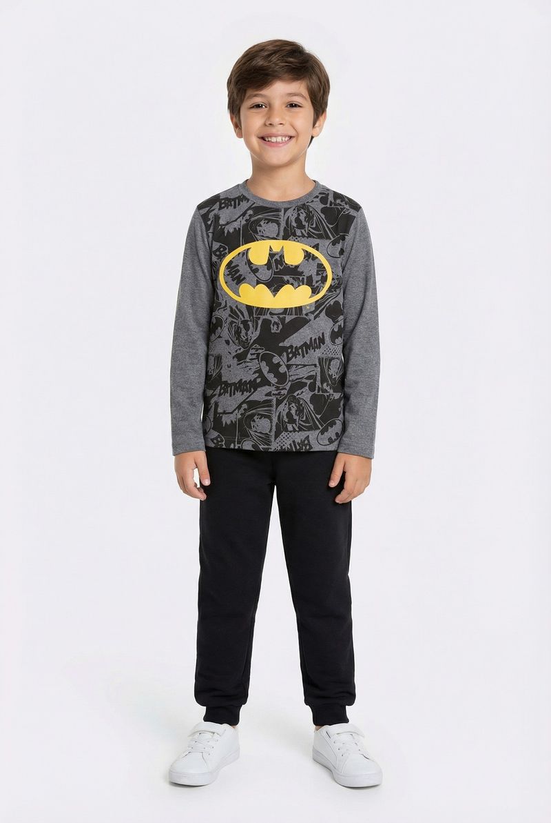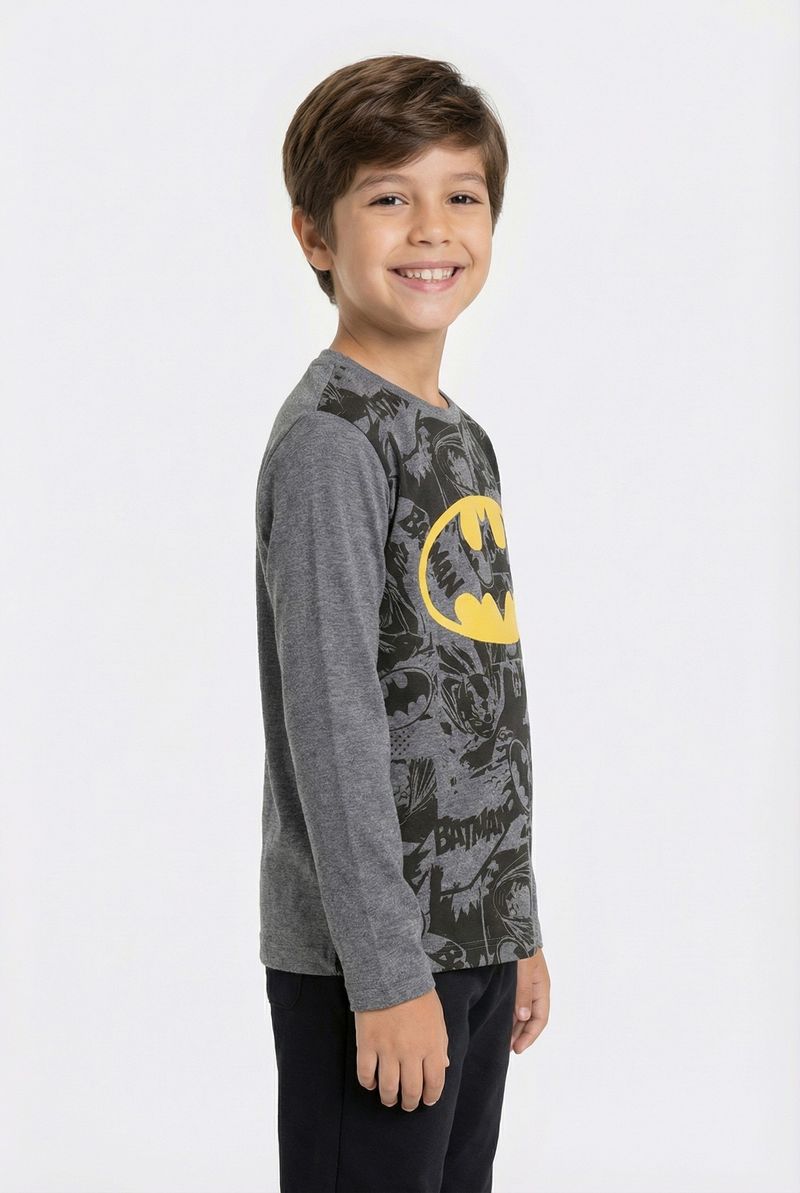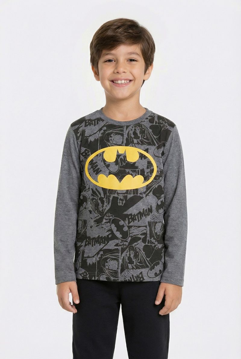Vista seu pequeno herói com a Camiseta Infantil Manga Longa Batman Caedu! Feita em 100% algodão de meia malha, oferece conforto e liberdade para brincar. Com estampa clássica do Batman, é a roupa infantil perfeita para aventuras diárias.