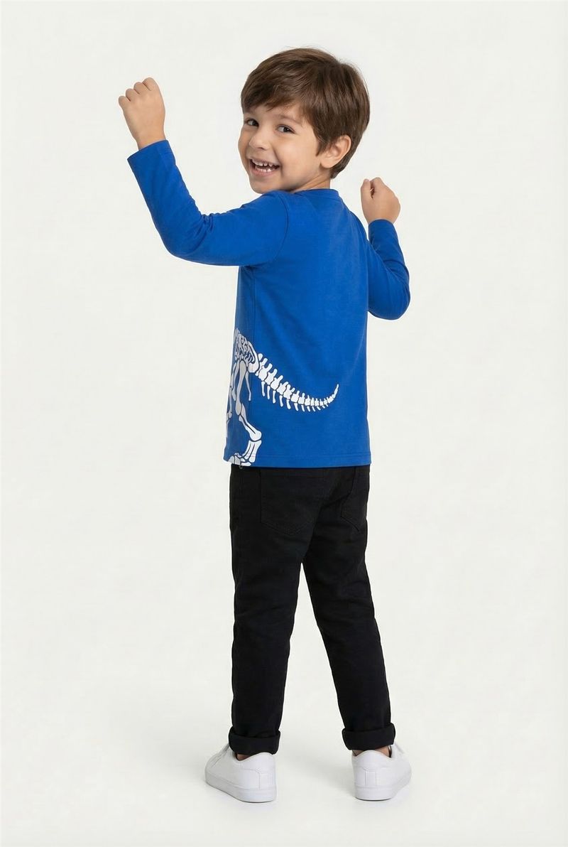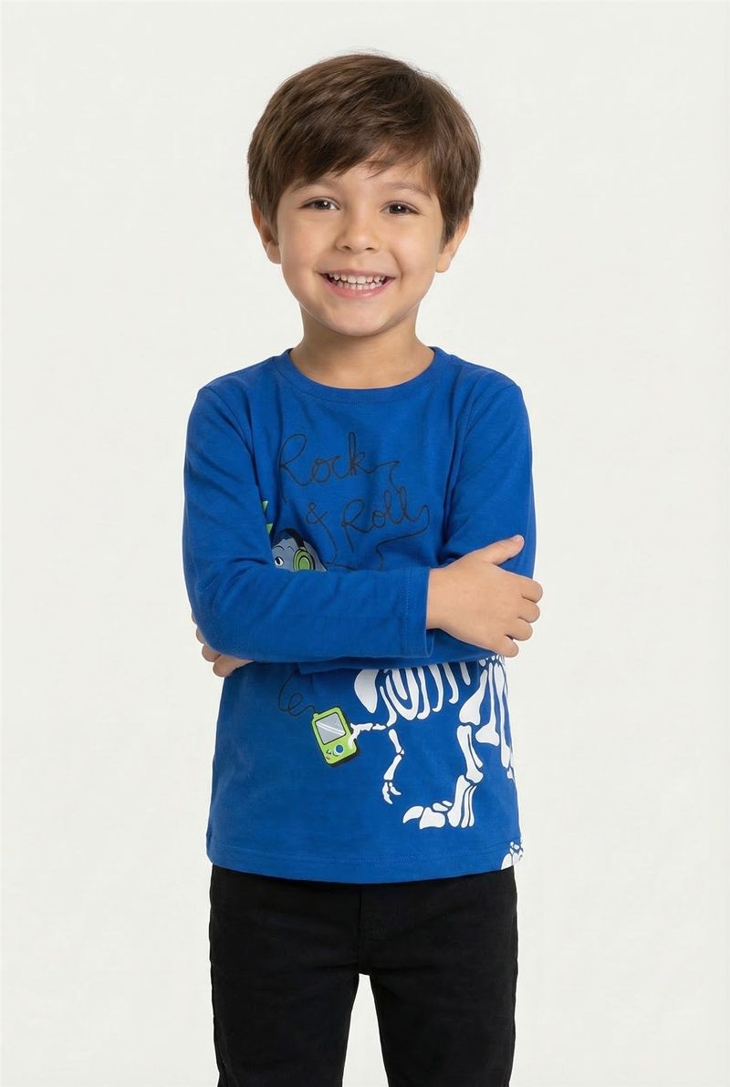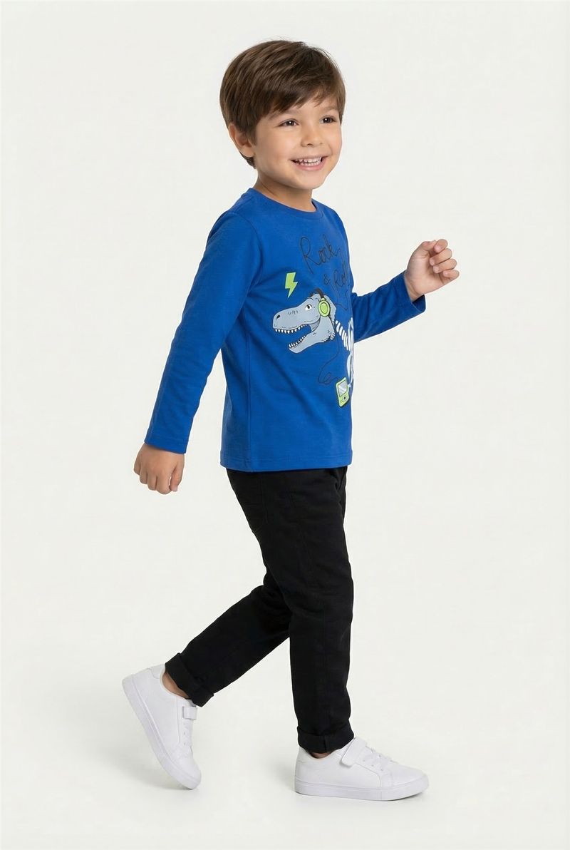 A Camiseta Infantil Manga Longa Caedu é perfeita para os pequenos roqueiros! Confeccionada em 100% algodão, oferece conforto e maciez. O design azul vibrante com estampa de dinossauro Rock & Roll garante um visual cheio de atitude e estilo para o dia a dia. Uma roupa ideal para a criançada.