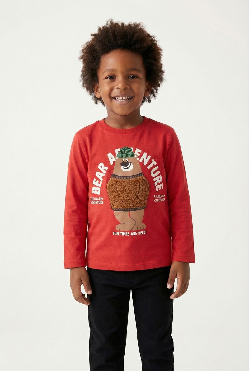 A Blusa Infantil Manga Longa Caedu é perfeita para a aventura! Em moletom sem felpa, esta roupa infantil vermelha vibrante oferece conforto e estilo. A estampa de urso aventureiro com detalhes em relevo inspira diversão. Essencial no guarda-roupa Caedu.