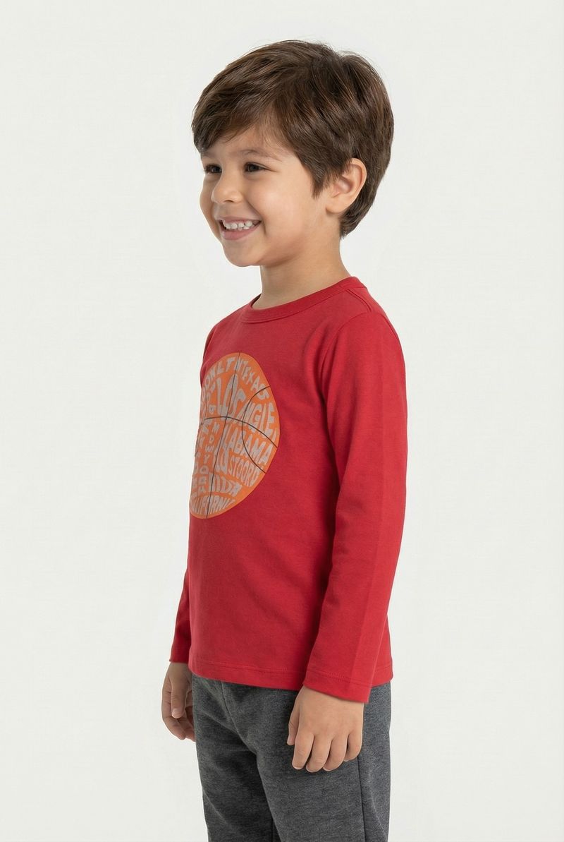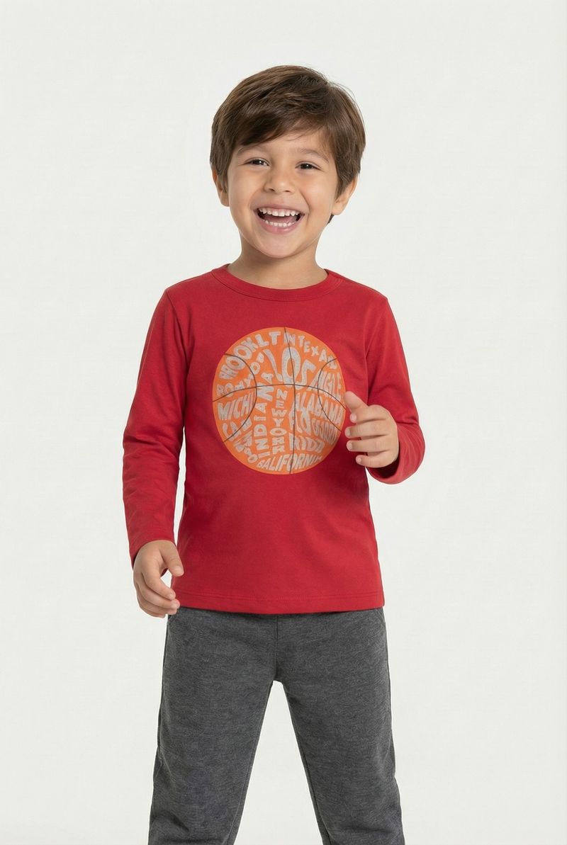 Vista seu pequeno com a Camiseta Infantil Manga Longa Vermelha Basquete Urbano Caedu, ideal para um visual cheio de energia. Em meia malha 100% algodão, garante conforto e toque macio. O tom vibrante, próximo ao vinho, é tendência, e a estampa de basquete com cidades americanas inspira aventura e estilo.