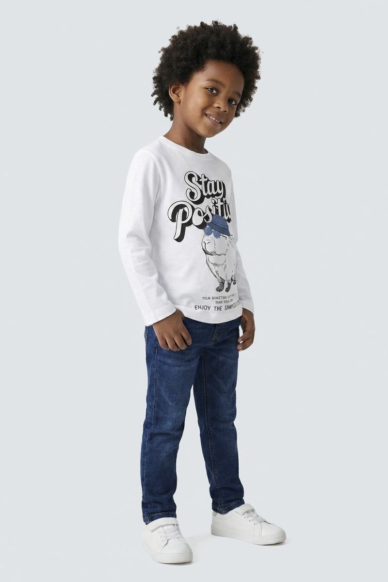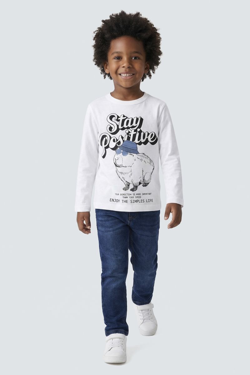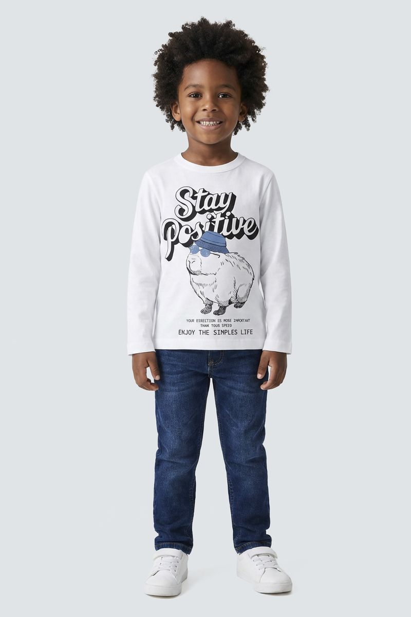 A camiseta infantil manga longa da Caedu oferece conforto e estilo para os pequenos. Confeccionada em meia malha 100% algodão, esta roupa infantil é perfeita para o dia a dia, com estampa motivacional de capivara 'Stay Positive' que inspira alegria e positividade.