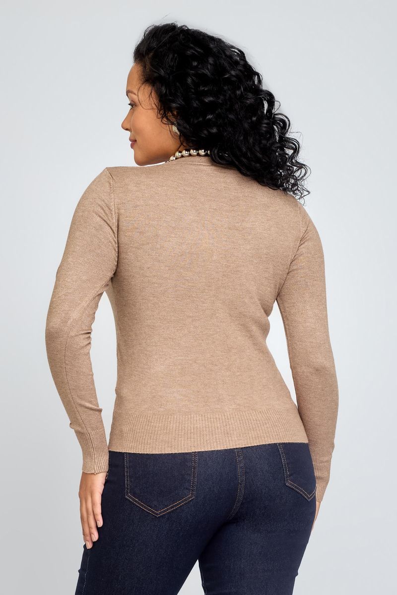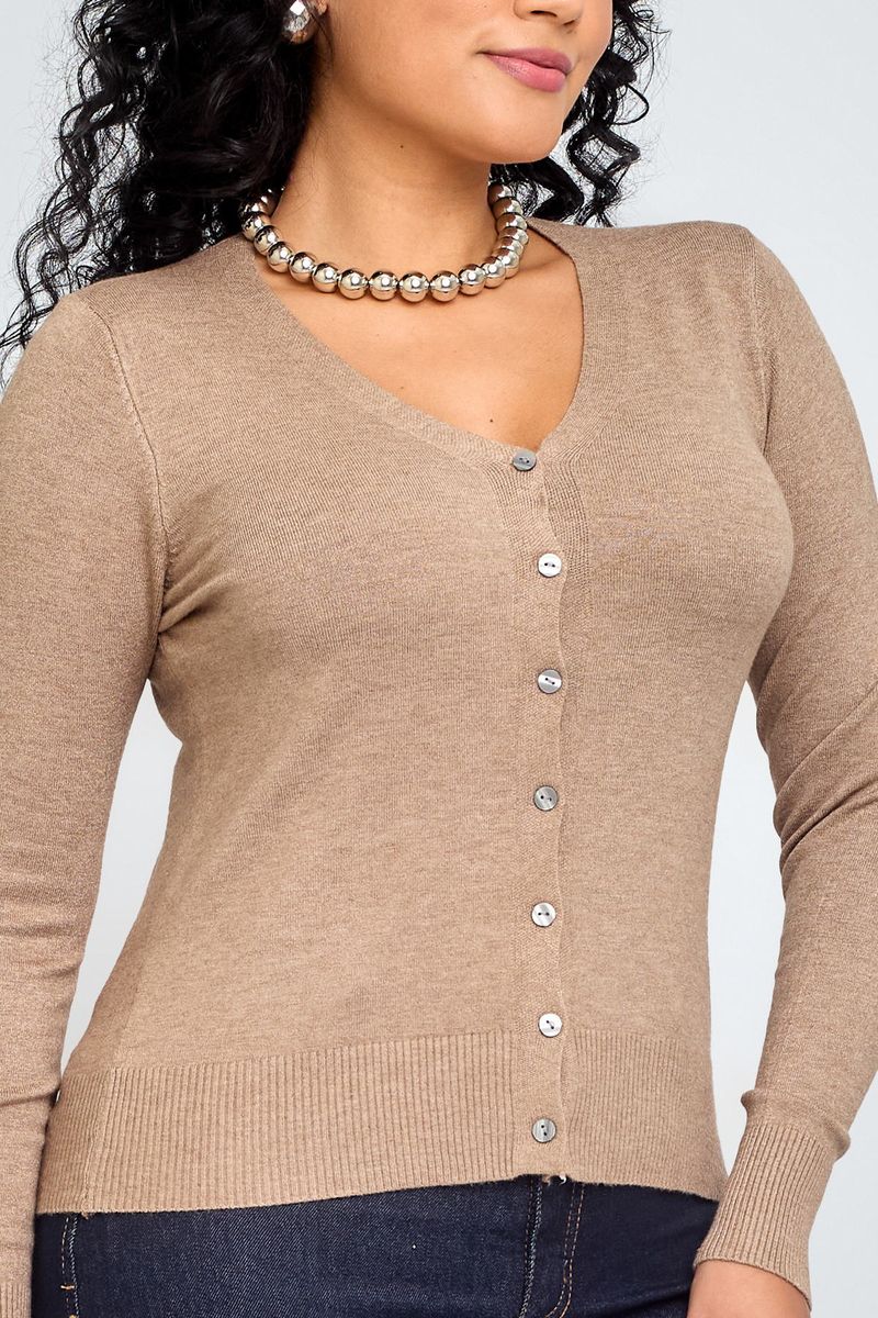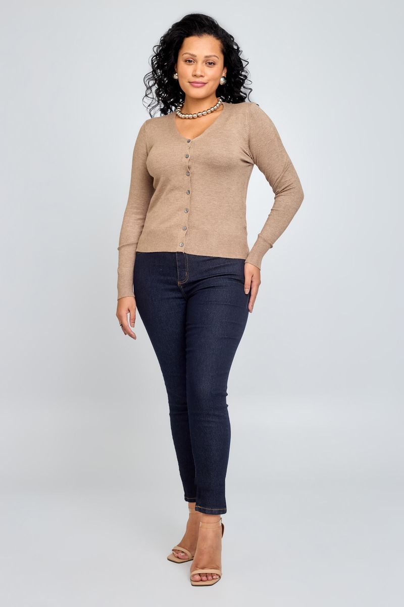Cardigan feminino casual de tricot, cor bege, ideal para compor looks de meia-estação.