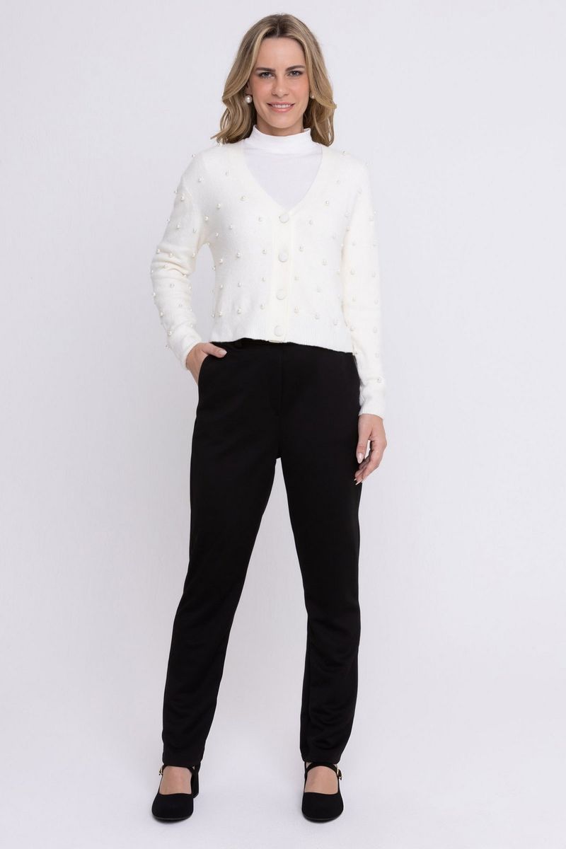 Cardigan confeccionado em tricô na cor branca com pérolas. Possui gola V, manga longa e botões frontais. Peça-chave em qualquer guarda-roupa, o cardigan é atemporal e prático, podendo ser utilizados em diversas ocasiões.