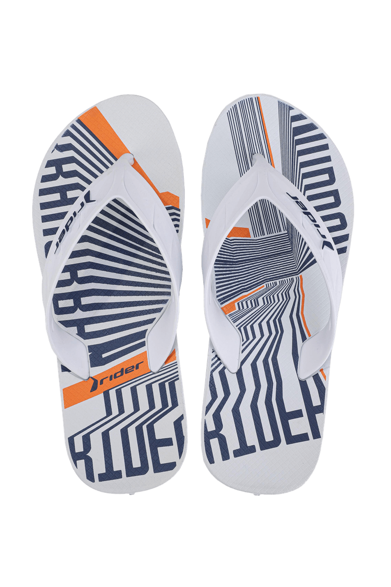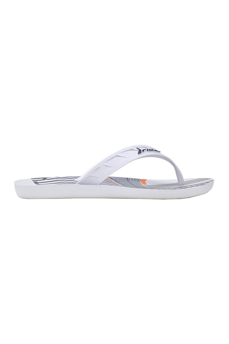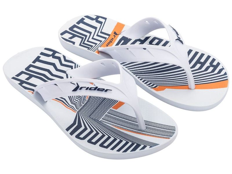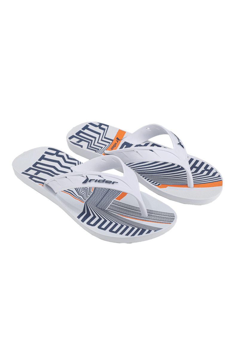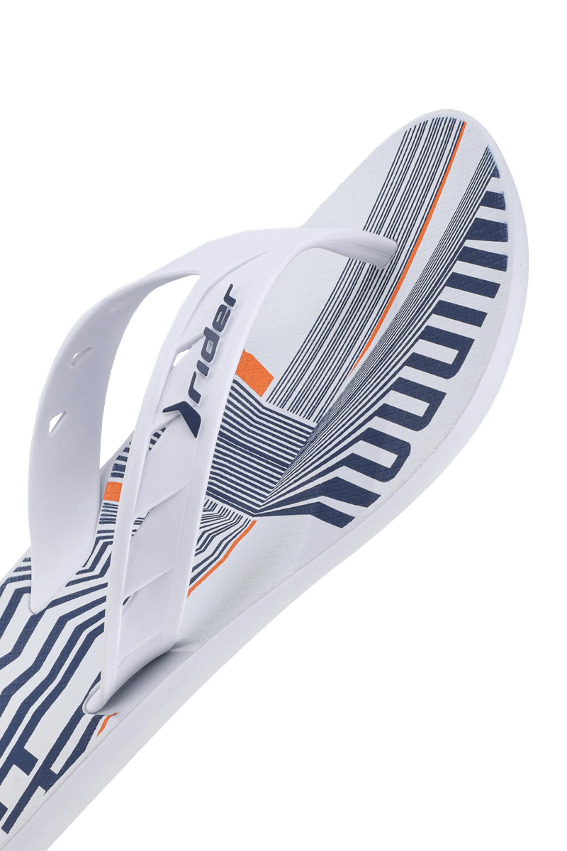 Chinelo masculino branco, produzido em borracha com bico arredondado e tira frontal. Conta com palmilha macia estampada em azul, com o nome da marca e solado emborrachado.