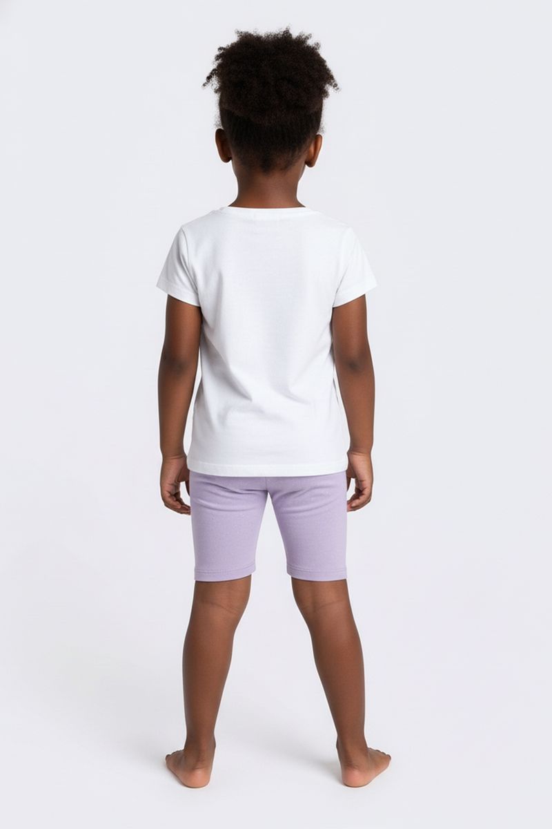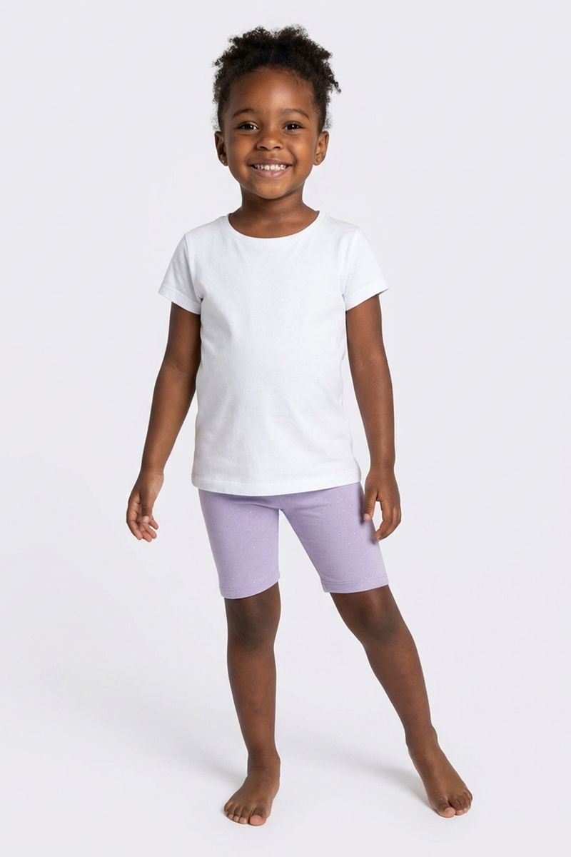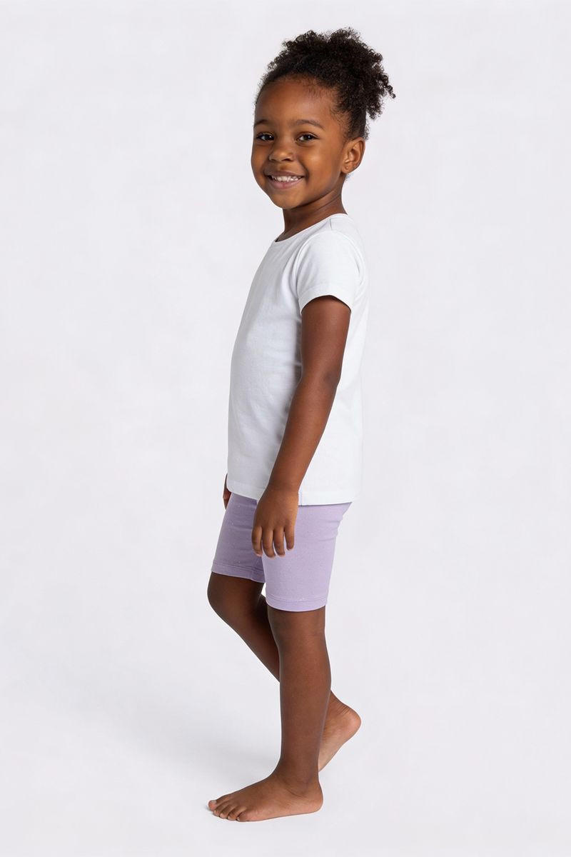 Combine o Shorts Ciclista Infantil Lilás com uma blusa branca básica para um visual casual, ou com uma blusa estampada para um toque mais divertido. Nos pés, tênis coloridos ou sapatilhas completam o look. Para um toque extra, adicione um casaquinho leve em dias mais frescos, criando um conjunto charmoso e confortável.