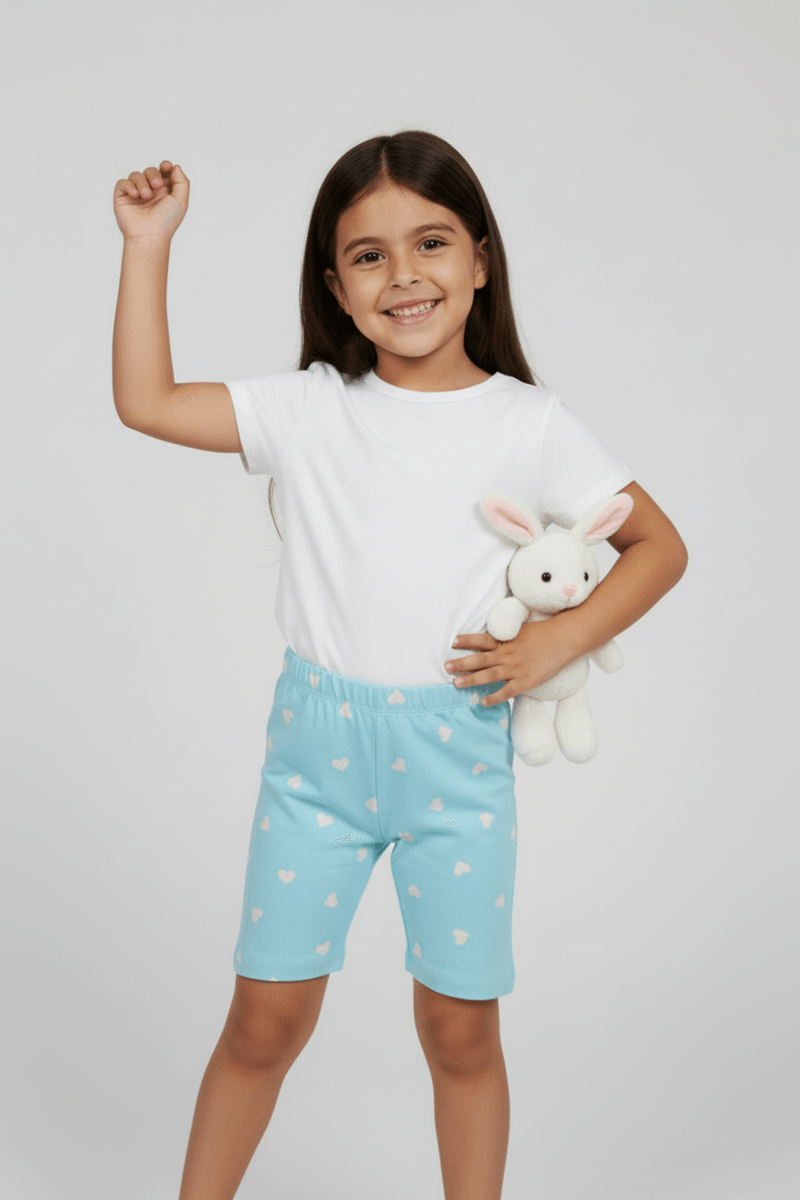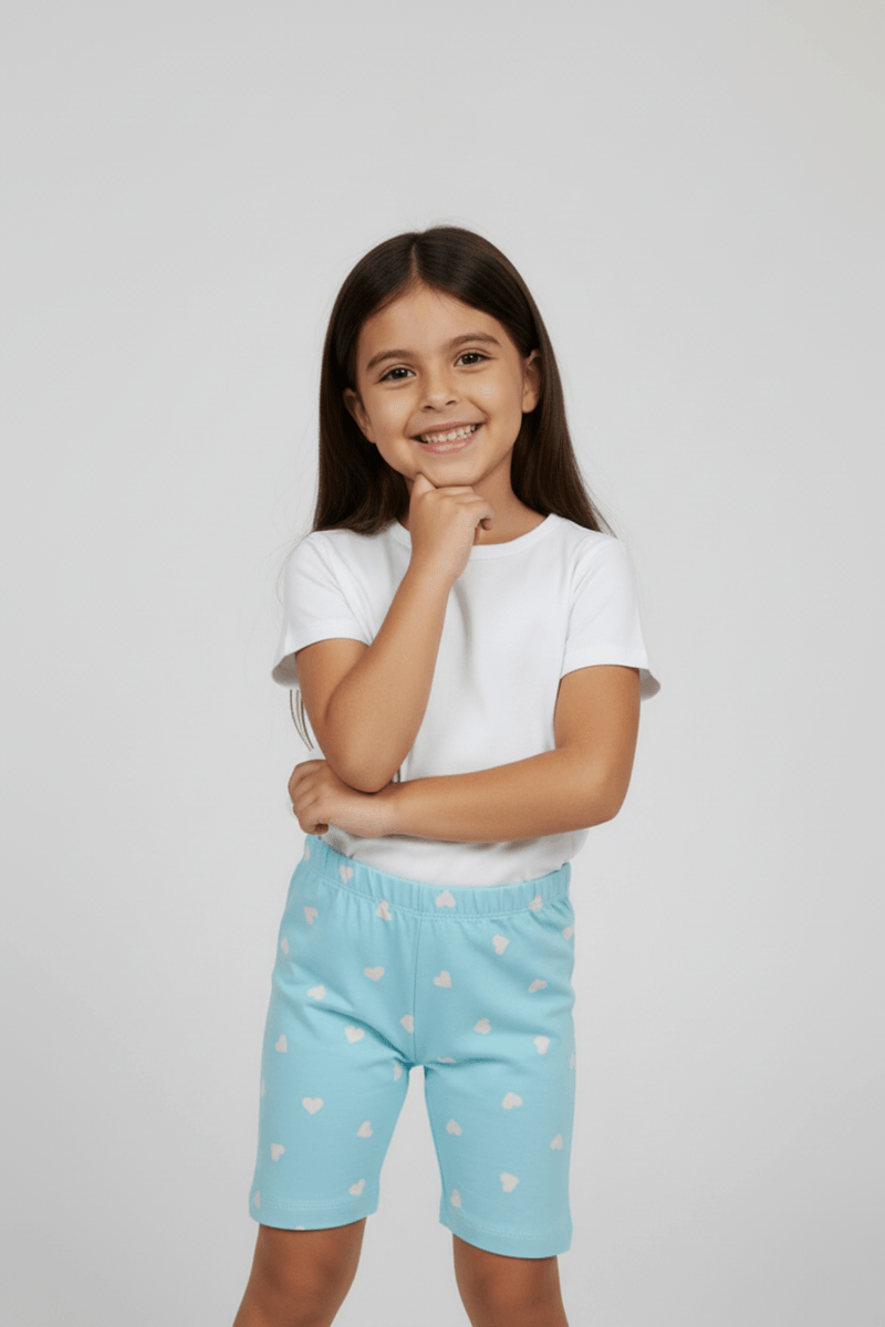A Caedu apresenta o shorts ciclista infantil em algodão, perfeito para meninas de 4 a 8 anos. Com sua estampa de corações e cor azul claro, oferece conforto e estilo para brincar com liberdade. Uma roupa infantil versátil e cheia de vida, disponível na Lojas Caedu com preço bom.