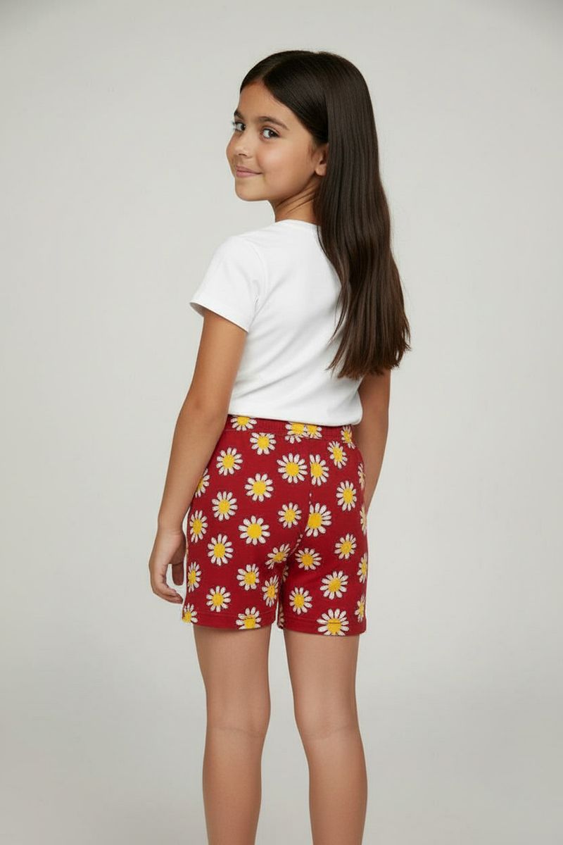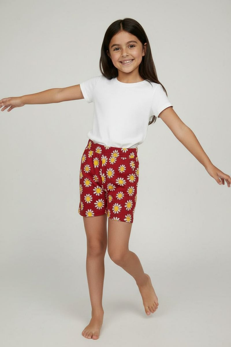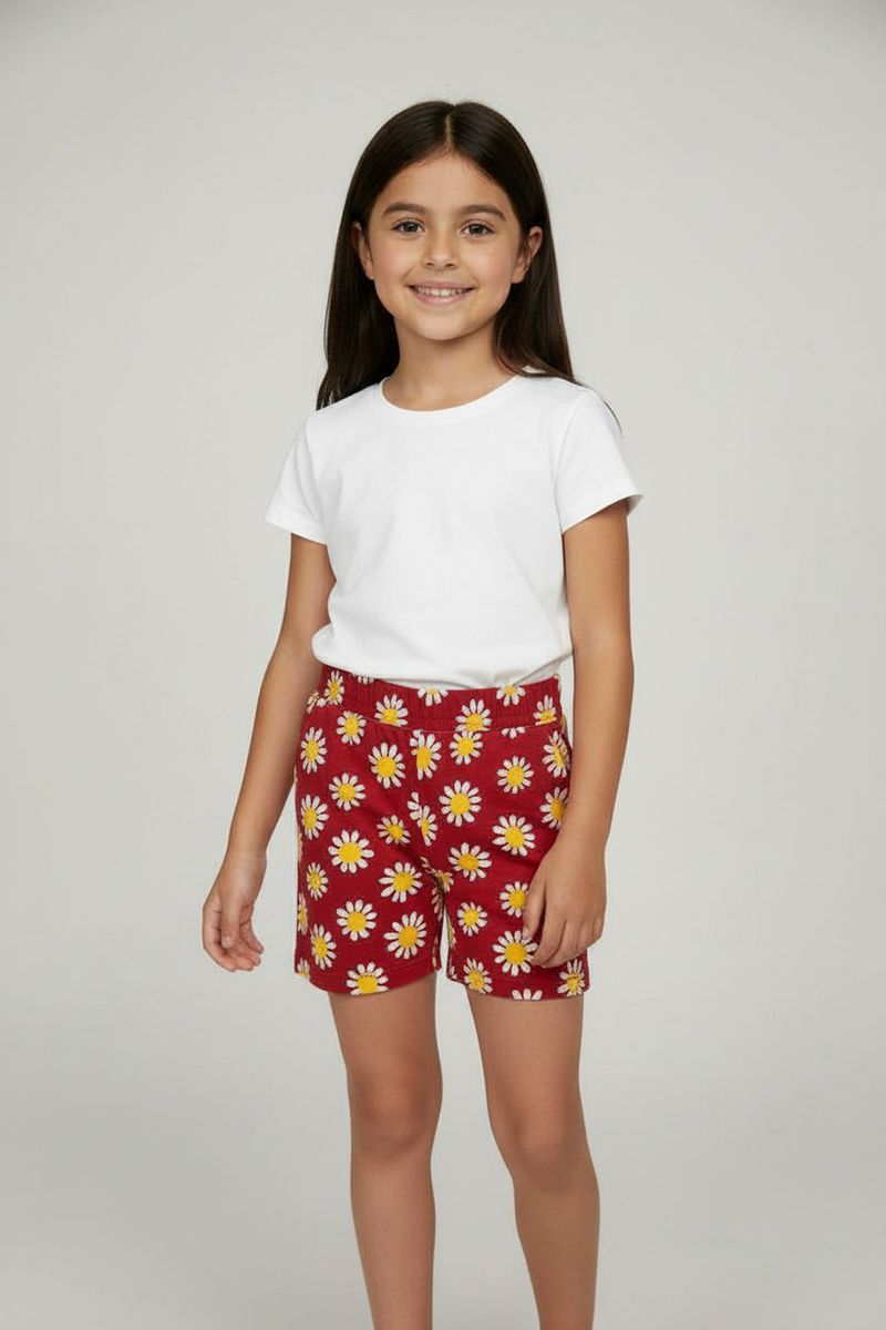 Combine o Shorts Infantil Menina Floral Margaridas Alegres com blusa branca básica para look clássico. Para toque divertido, use blusa amarela. Nos pés, sandálias coloridas ou tênis brancos complementam. Tiaras florais finalizam com charme.