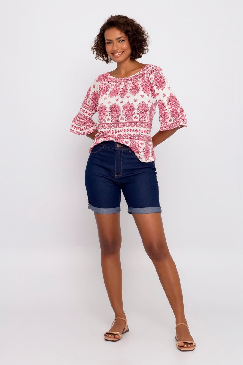 Blusa feminina com modelagem ciganinha. A peça possui estampa paisley, decote ombro a ombro e manga 3/4.