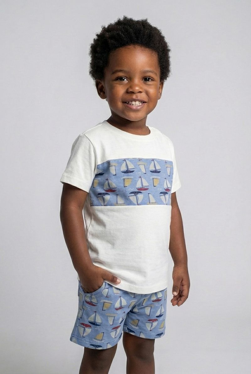 O Conjunto Infantil Náutico Barquinhos Caedu oferece estilo e conforto para os pequenos exploradores. Com blusa de recorte e short estampado, este conjunto é perfeito para aventuras, garantindo liberdade e um visual encantador. Uma roupa infantil cheia de charme para o dia a dia.