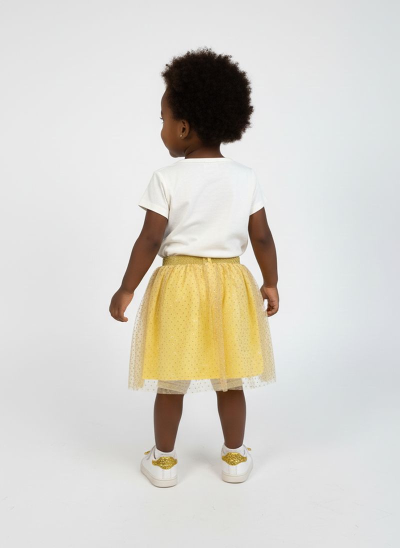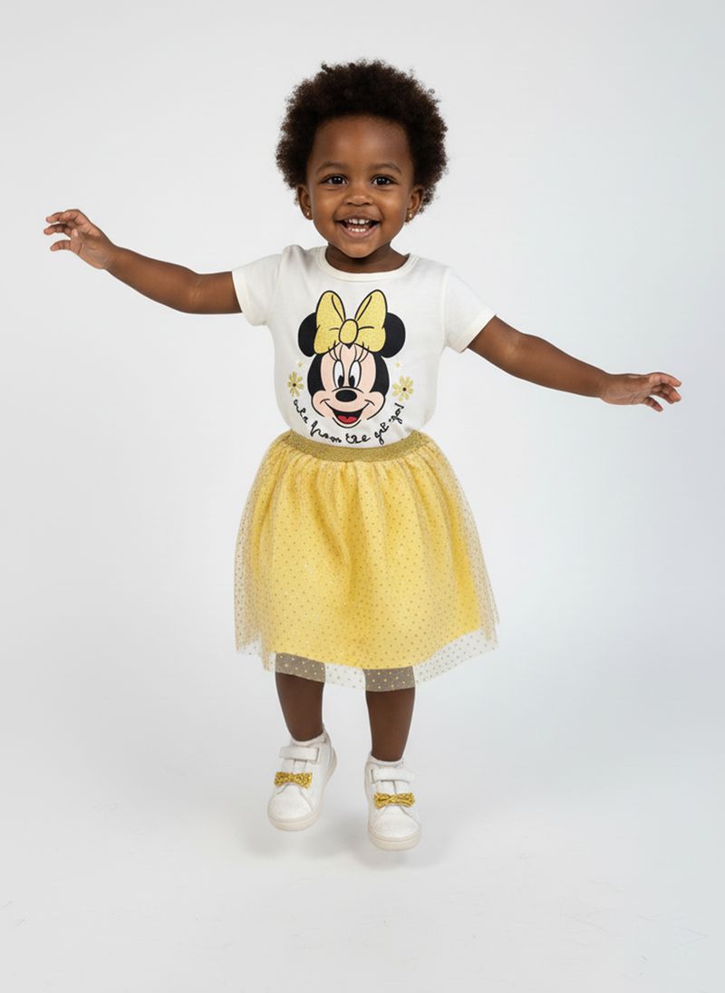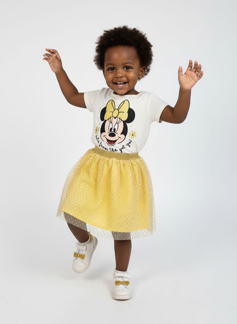 Desperte a magia no guarda-roupa da sua pequena com o Conjunto Minnie Mouse Encantador Caedu! Esta roupa infantil vibrante apresenta uma blusa off white estampada com a adorável Minnie e uma saia tule amarela com glitter, ideal para momentos de pura alegria e estilo. Um melhor preço para um look inesquecível!