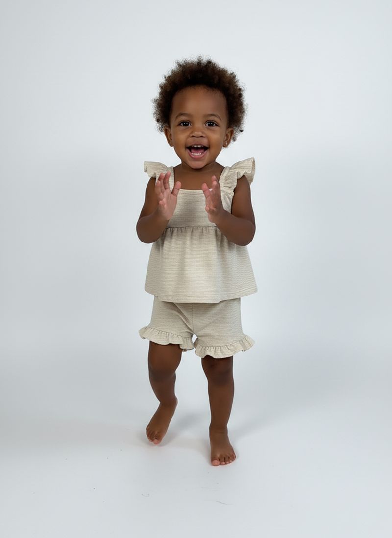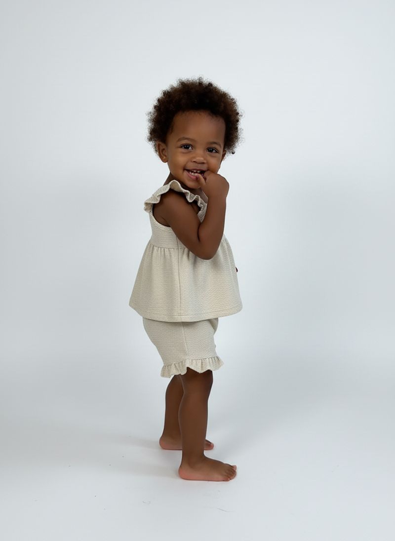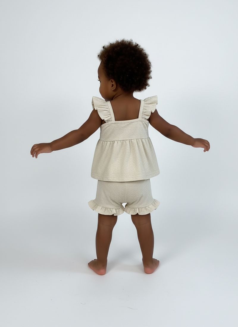 O Conjunto Bebê Caedu Ribana com Babados e Lurex Dourado oferece o máximo de conforto e estilo para sua pequena. Com tecido ribana macio, blusa com decote quadrado e shorts com babados, é a escolha perfeita para um visual encantador e delicado, ideal para o dia a dia.