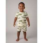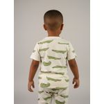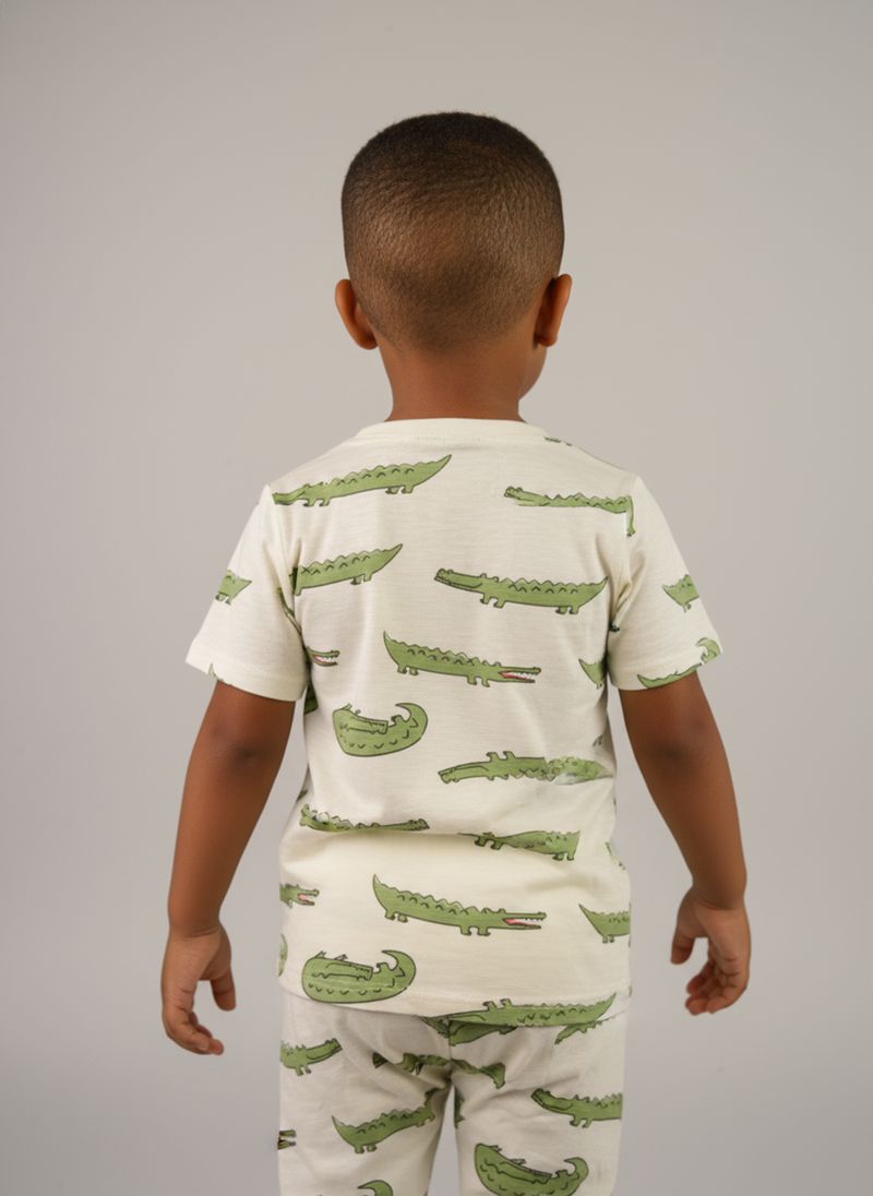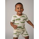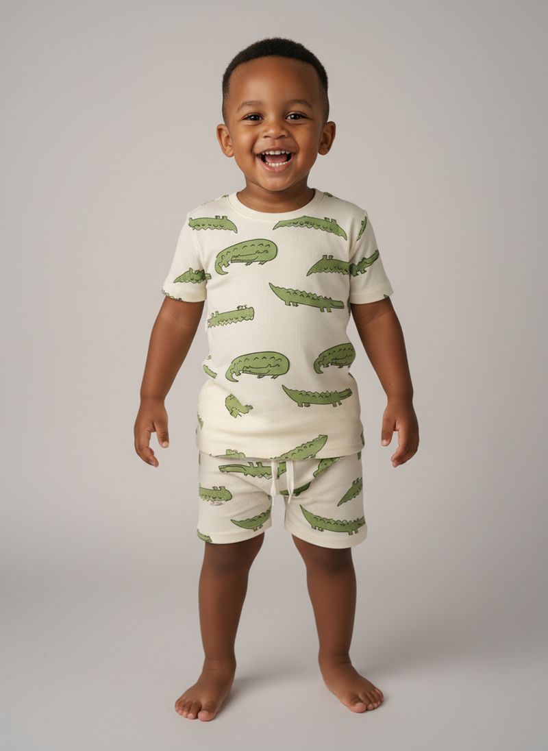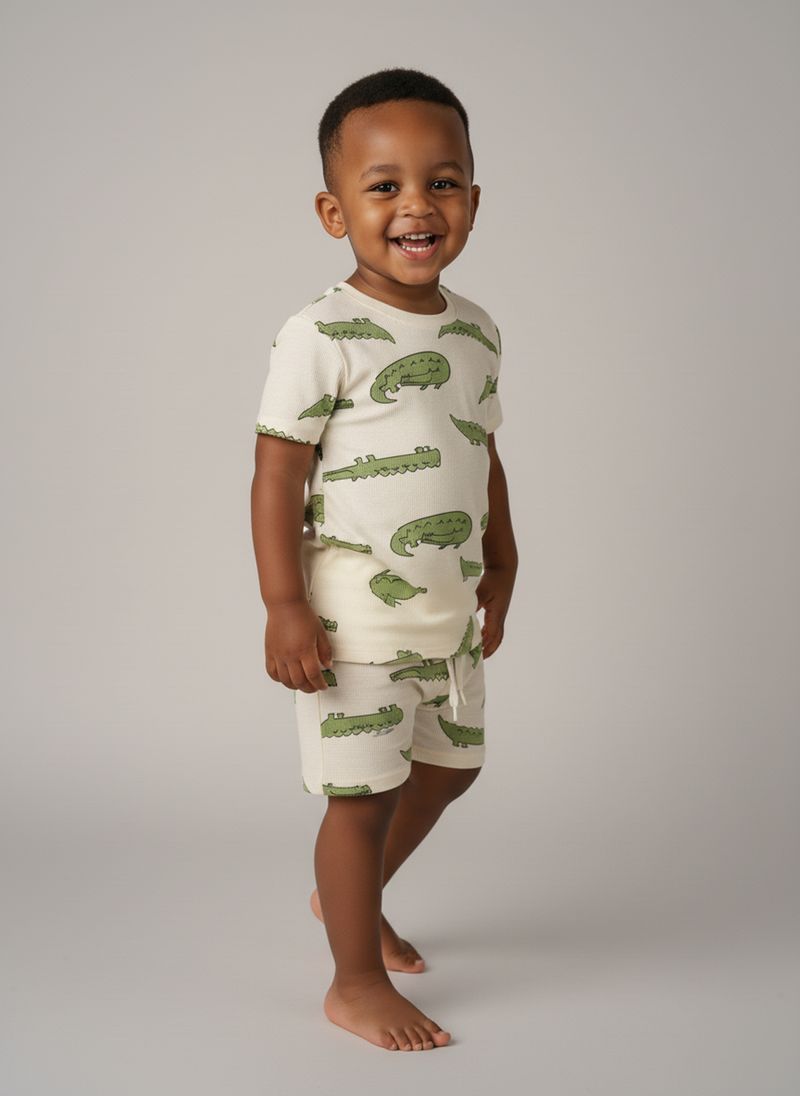 O Conjunto Infantil Jacaré Estampado Divertido Caedu oferece conforto e um visual alegre para os pequenos. Composto por blusa de manga curta e shorts, ambos com estampa de jacarés verdes em fundo creme e textura canelada, garante liberdade e estilo para brincar. Perfeito para o dia a dia!
