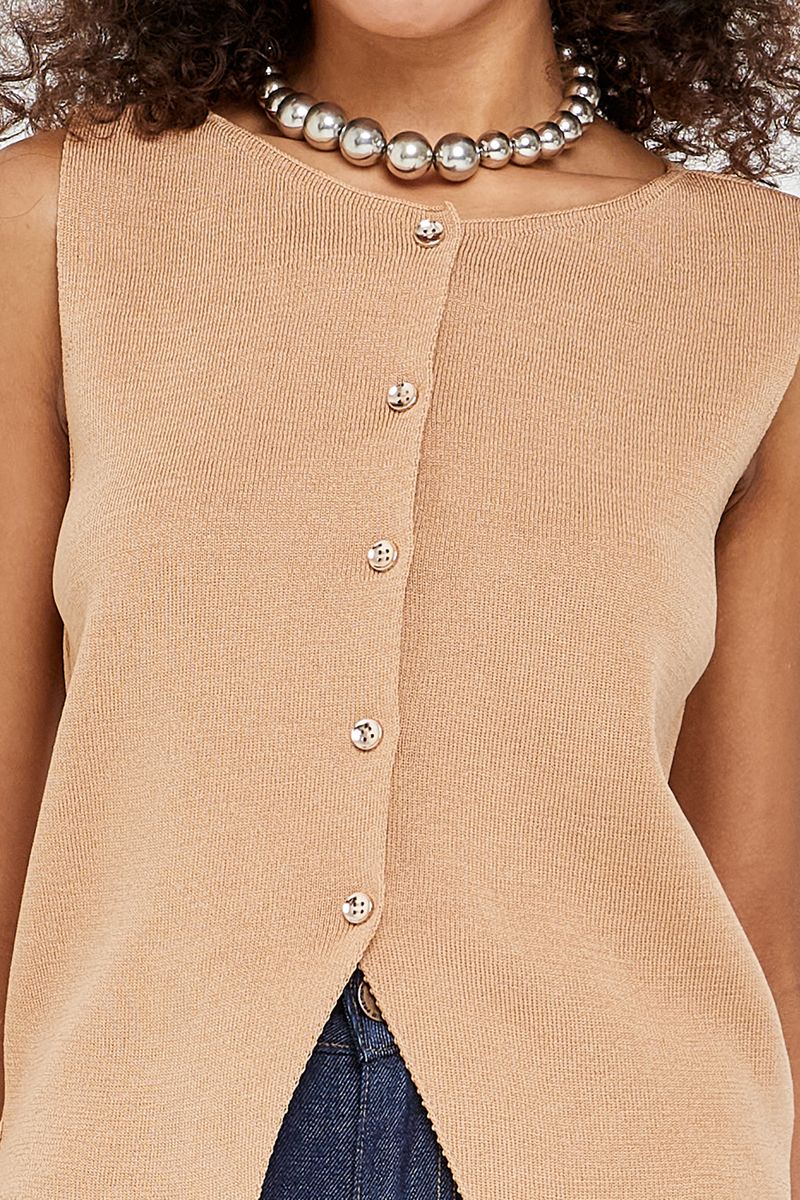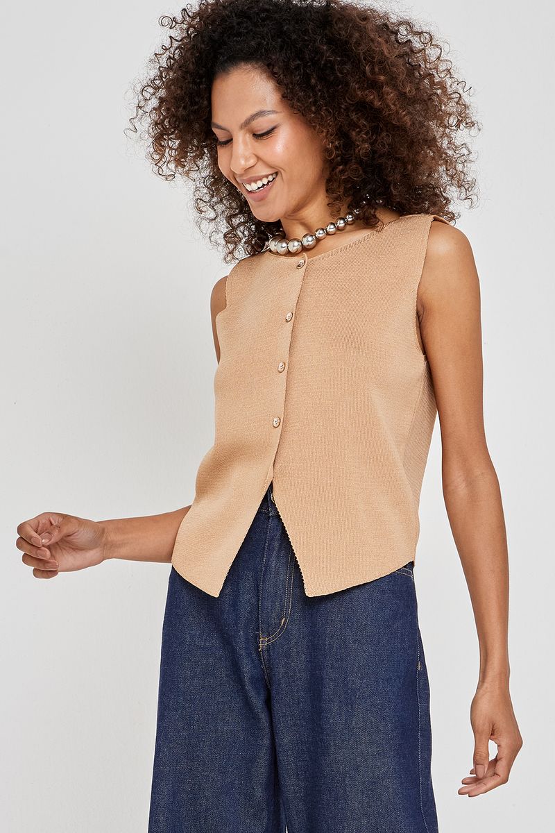 Eleve seu visual com a Jaqueta Colete Feminina Tricot Caedu. Confeccionada em tricot macio bege, oferece conforto e versatilidade. Com botões e fenda lateral, é a peça ideal para looks modernos e sofisticados, adicionando um toque de charme à sua moda.