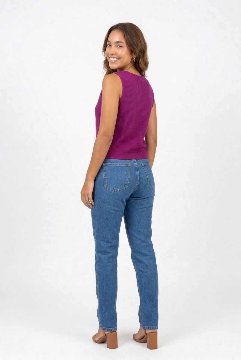Combine o colete com uma calça jeans de lavagem média para um look casual chic. Para um toque sofisticado, use com saias midi ou calças de alfaiataria. Complete com sapatos de salto bloco caramelo, tênis brancos para um estilo despojado ou botas para um visual mais ousado. Adicione acessórios discretos para realçar a cor vibrante.