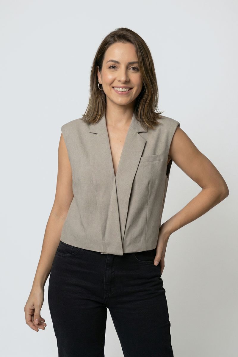 O Colete Feminino de Alfaiataria Cropped Transpassado Cinza Elegante, em poliéster, é a peça ideal para roupas modernas. Com design cropped, oferece sofisticação e versatilidade, elevando seu estilo.