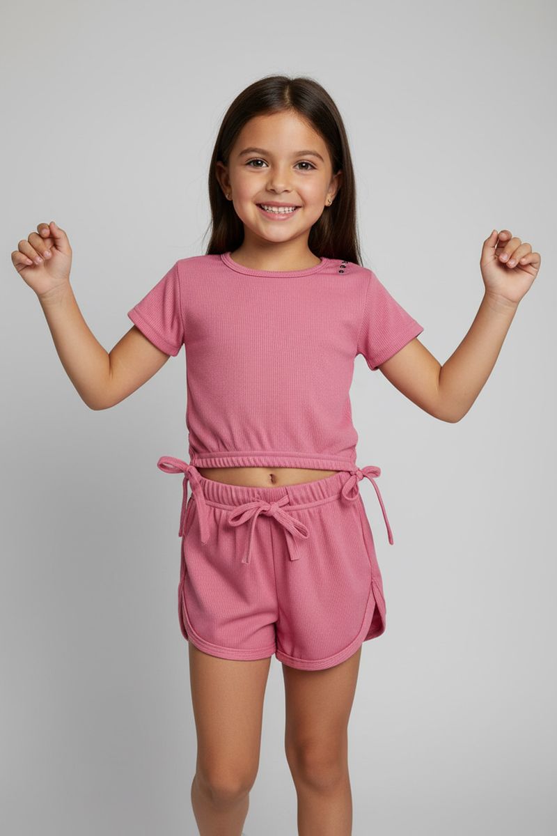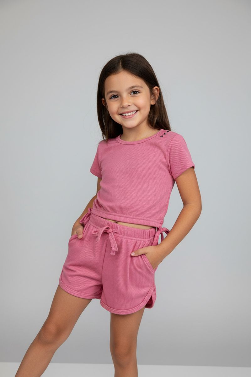 Vista sua pequena com o Conjunto Infantil Menina Caedu. Em ribana rosa médio, a blusa com botões e o shorts com laços laterais oferecem conforto e estilo. Perfeito para a moda infantil, garantindo liberdade para brincar e explorar com charme.