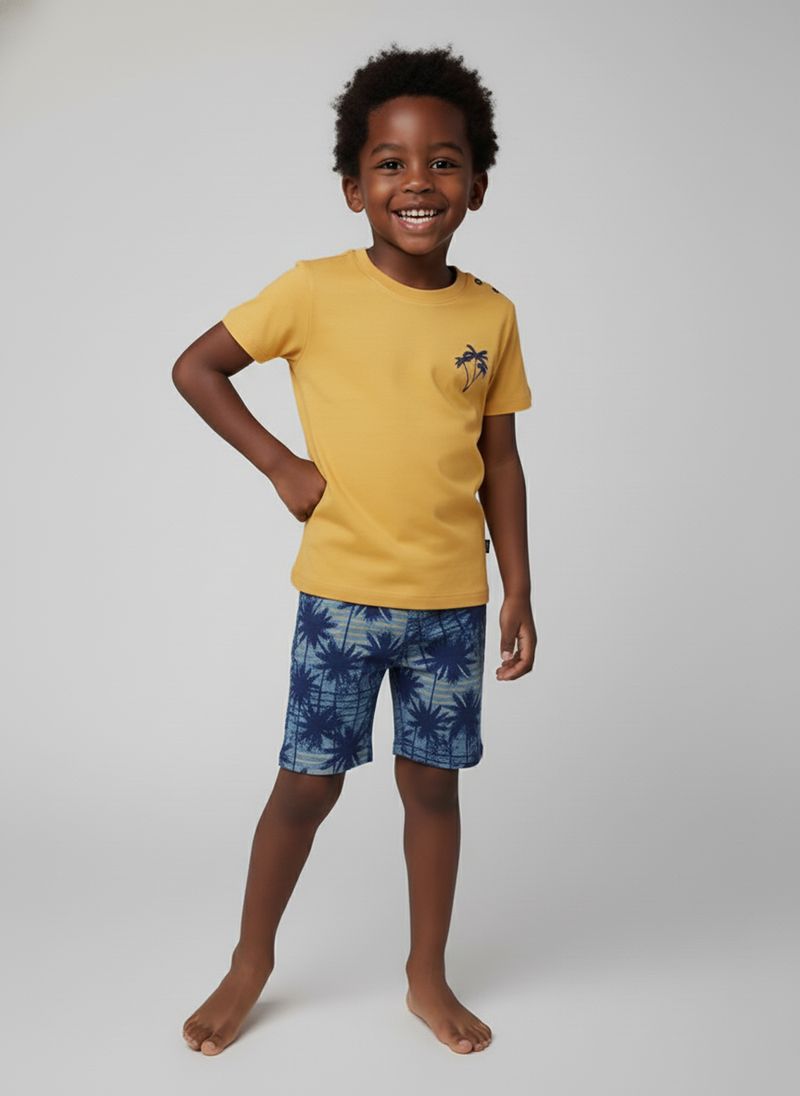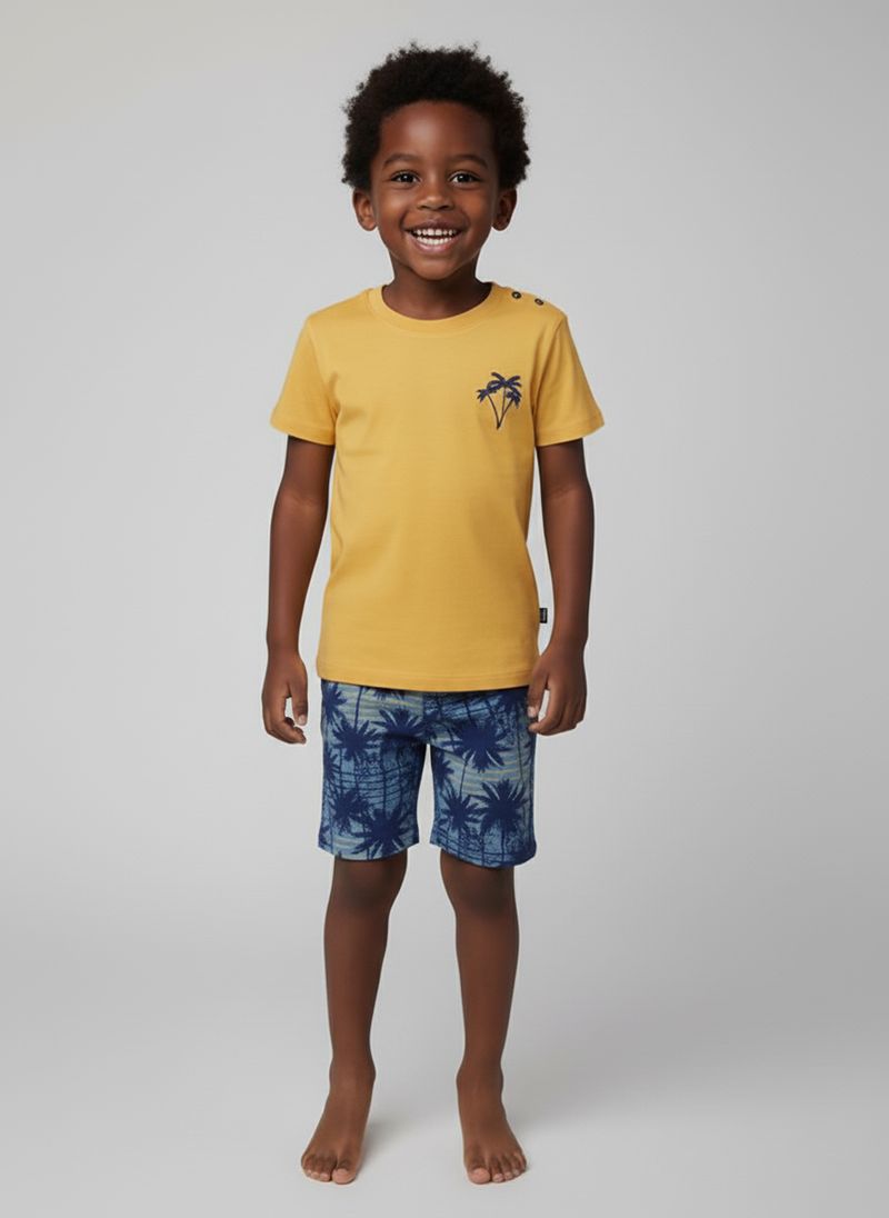Conjunto Infantil Caedu: Blusa Amarela Coqueiro e Shorts Estampado Azul
