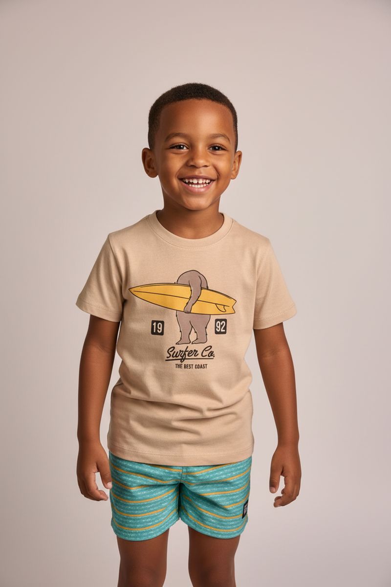 Prepare seu pequeno para aventuras com o Conjunto Infantil Surfer Co.! A blusa bege claro de meia malha 100% algodão oferece conforto e estilo com sua estampa de urso surfista. O shorts listrado em tons vibrantes completa o visual, ideal para o dia a dia. Garanta já essa roupa infantil cheia de personalidade!