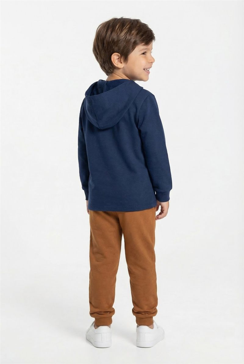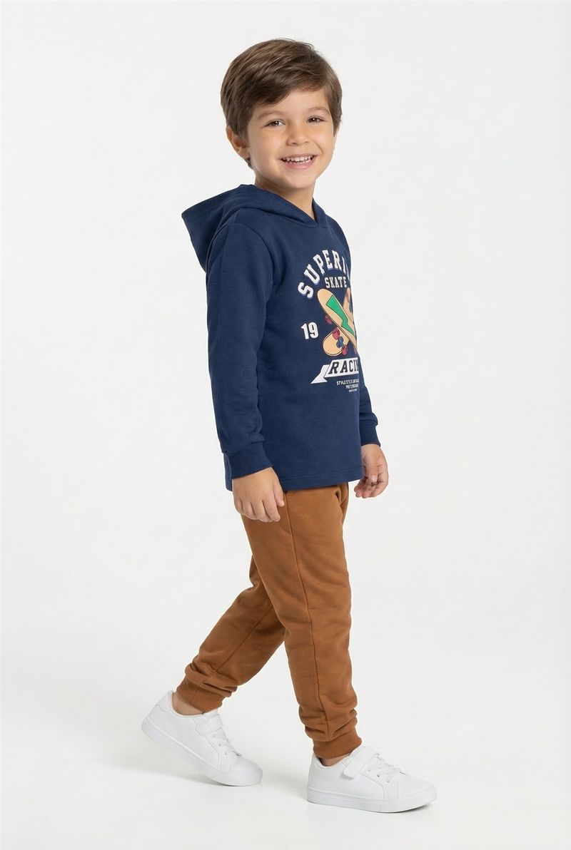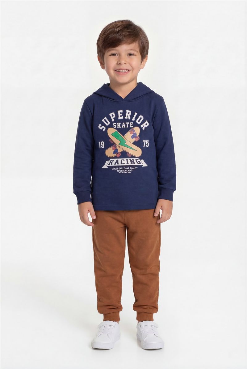 O Conjunto Infantil Caedu oferece conforto e estilo. Blusão de moletom com capuz azul marinho 'Superior Skate' e calça caramelo, ambos 100% poliéster. Uma roupa infantil durável e moderna.