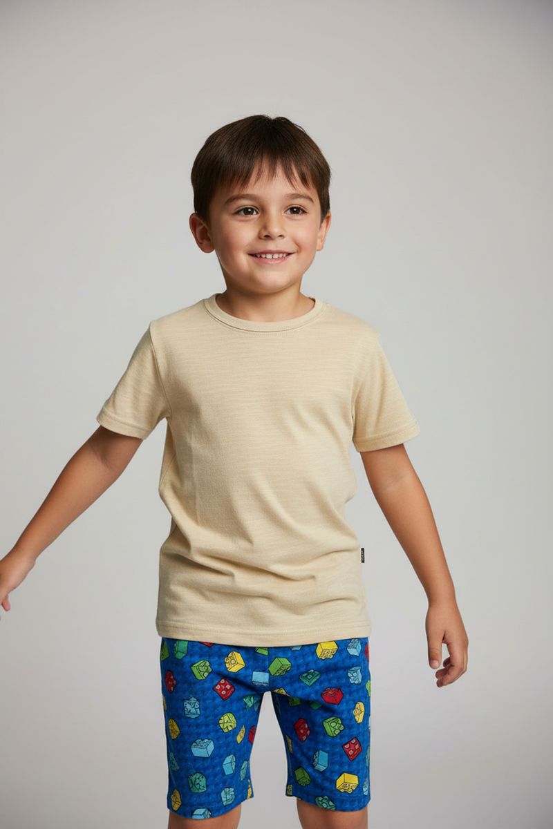 Desperte a alegria e o conforto com o Conjunto Infantil Caedu! Em meia malha 100% algodão, esta roupa oferece toque suave e liberdade. A camiseta bege lisa e a bermuda azul com estampa de blocos coloridos garantem um visual divertido e cheio de estilo. A moda infantil ideal!