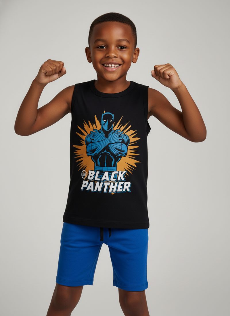 Prepare seu pequeno herói para a aventura com o Conjunto Infantil Pantera Negra Marvel Caedu! Com regata estampada e bermuda azul vibrante, este conjunto em 100% algodão oferece conforto e estilo para o dia a dia. Perfeito para os fãs do universo Marvel, garantindo liberdade para brincar com a melhor roupa infantil.