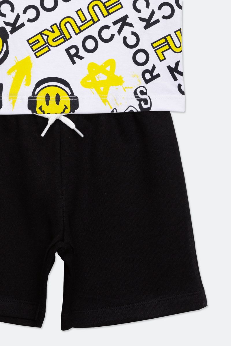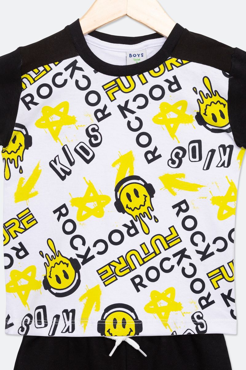 Conjunto infantil com camiseta e shorts rock, preto e branco, ideal para os pequenos que amam um estilo mais descolado.