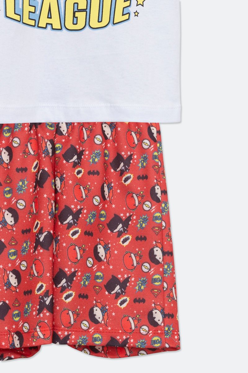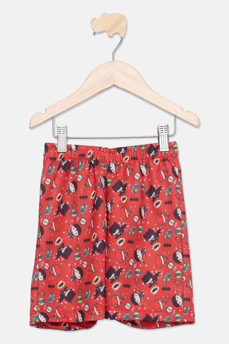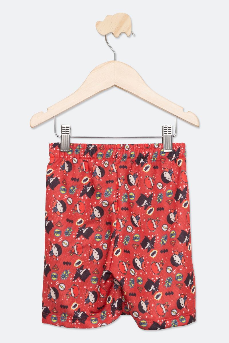 Conjunto infantil com estampa da Liga da Justiça, composto por camiseta e shorts. A camiseta possui gola redonda e manga curta; o shorts possui elástico aplicado no cós e caimento reto.