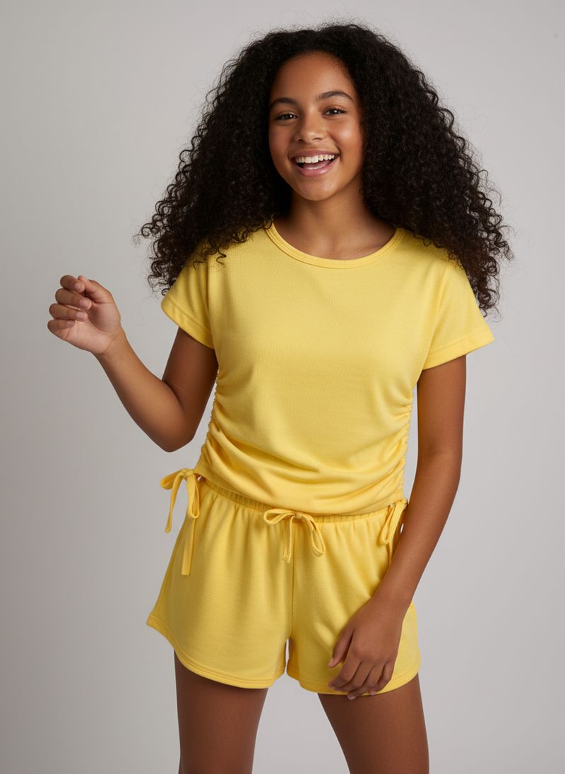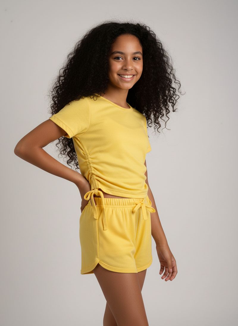 Combine o conjunto amarelo com tênis brancos para um look casual e divertido. Para um toque mais despojado, adicione uma jaqueta jeans clara ou um colete. Sandálias coloridas ou sapatilhas completam o visual com charme. Acessórios como bonés e mochilas pequenas também são ótimas opções para criar looks completos e cheios de personalidade.