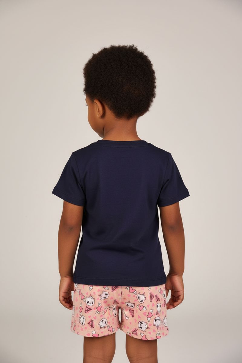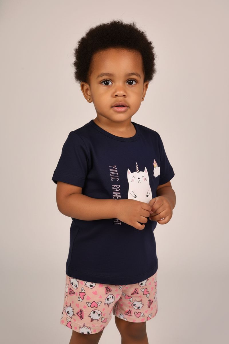 O Conjunto Infantil Caedu é pura magia e conforto! Em 100% algodão de meia malha, a blusa regata azul marinho com estampa de gatinho unicórnio e arco-íris, e o shorts rosa claro, é a roupa infantil ideal. Perfeito para as pequenas, uma moda infantil divertida e cheia de charme!