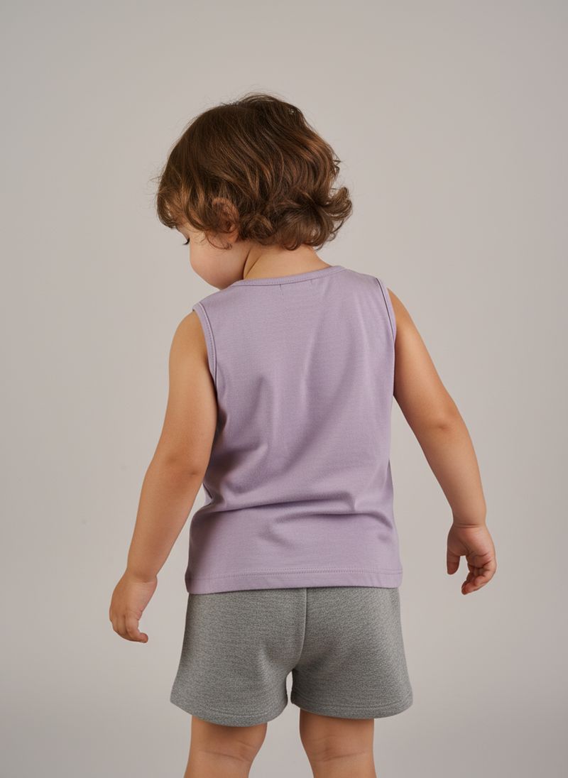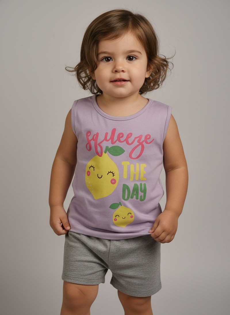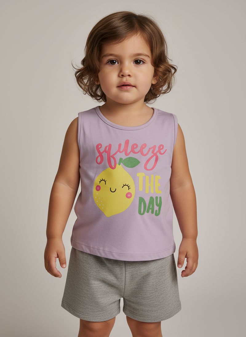 Vista sua pequena com o Conjunto Infantil Regata Limão 'Squeeze The Day' Caedu, perfeito para dias cheios de alegria. Confeccionado em meia malha, oferece conforto e liberdade. A regata lilás com estampa vibrante e o shorts cinza mescla criam um look divertido e cheio de estilo para a moda infantil.