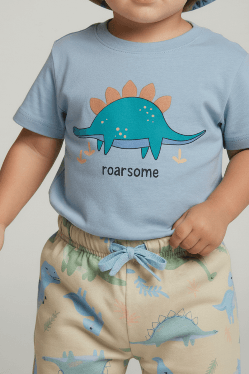 Prepare seu pequeno para a diversão com o Conjunto Infantil Caedu Dino Roarsome! Feito em meia malha, este conjunto com camiseta azul, short estampado e chapéu bucket oferece conforto e estilo para o dia a dia. Uma roupa barata e cheia de personalidade para as aventuras do seu filho, disponível nas Lojas Caedu.