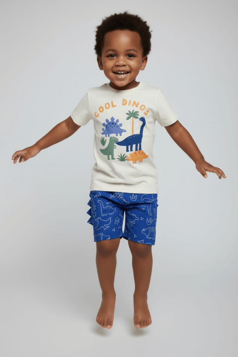 O Conjunto Infantil Menino 'Cool Dinos' Caedu oferece conforto e liberdade para a aventura diária. Em meia malha, a camiseta off-white com estampa 'COOL DINOS' e a bermuda azul com spikes e dinossauros são a roupa infantil perfeita. Estilo e qualidade Caedu com bom preço.