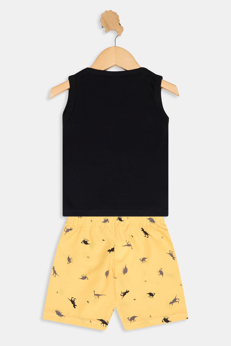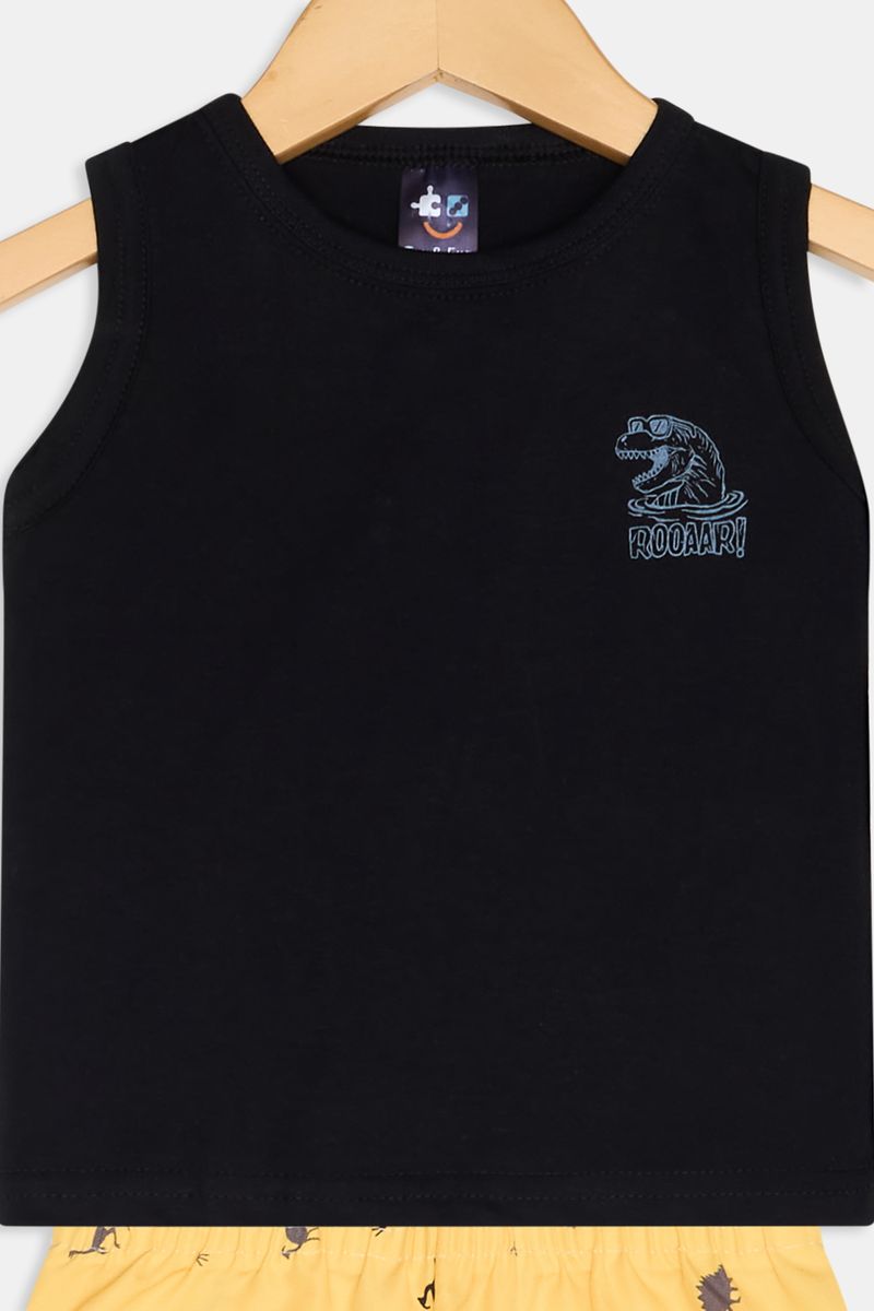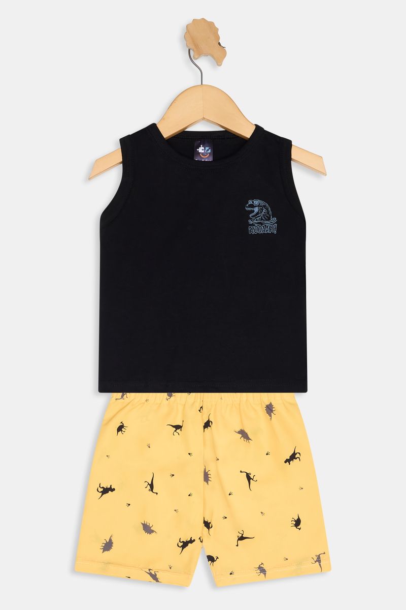 Prepare seu pequeno para aventuras com o Conjunto Infantil Caedu! Composto por regata preta e short amarelo vibrante, este conjunto de meia malha apresenta estampas divertidas de dinossauros. Ideal para o dia a dia, oferece conforto e muito estilo para os meninos.