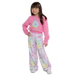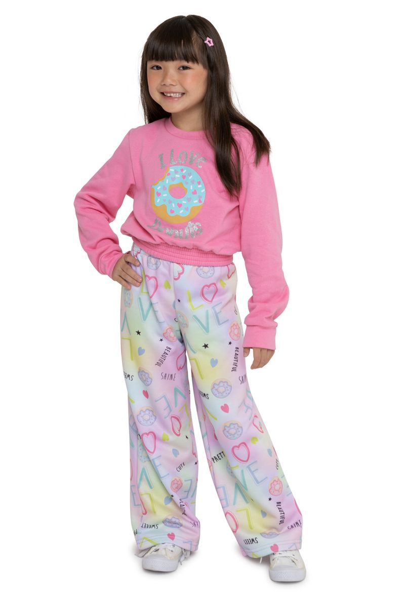 Conjunto infantil, confeccionado em moletom, composto por blusa e calça. Possui blusa rosa com decote redondo, estampa de donuts, manga longa; calça com cós elástico.